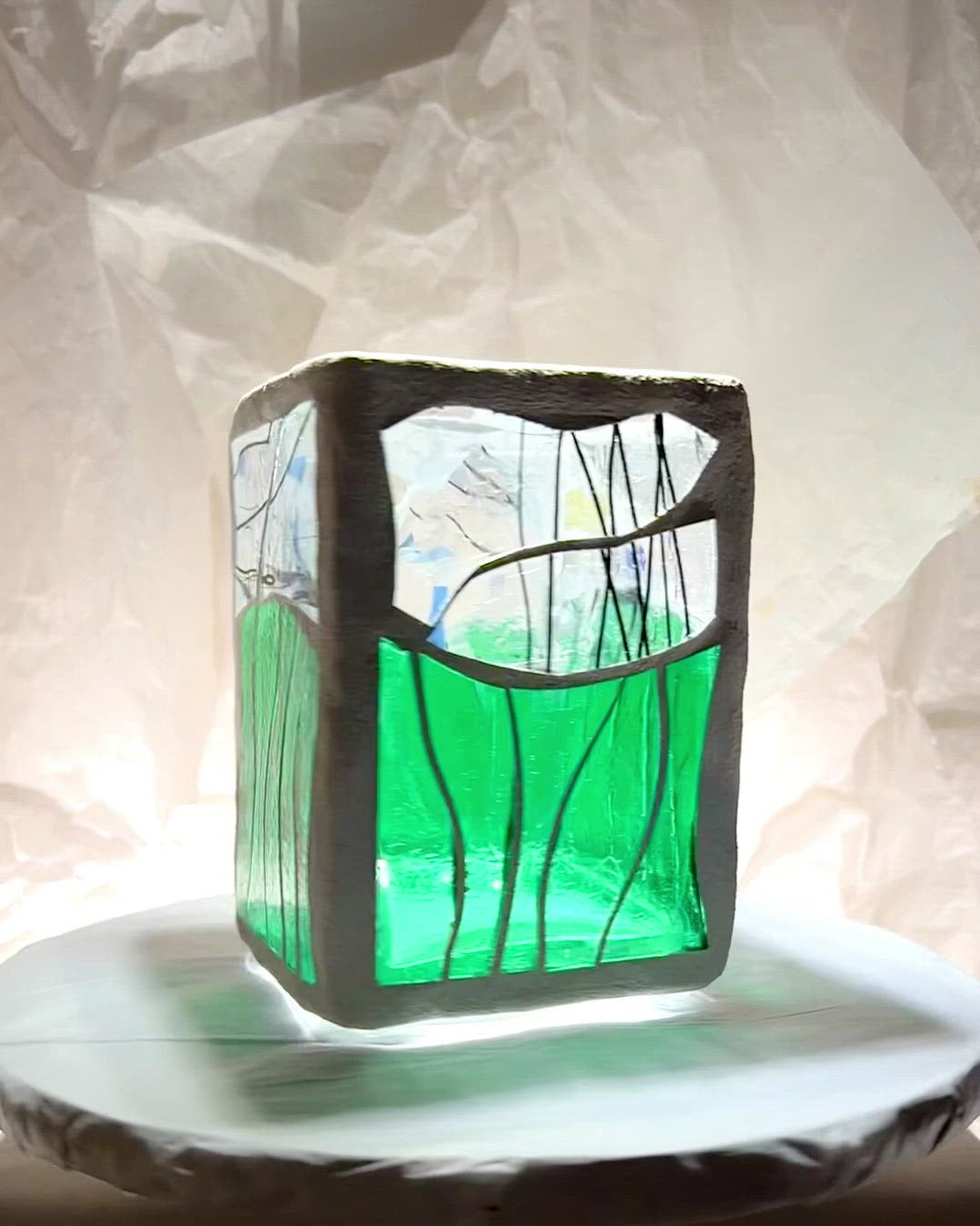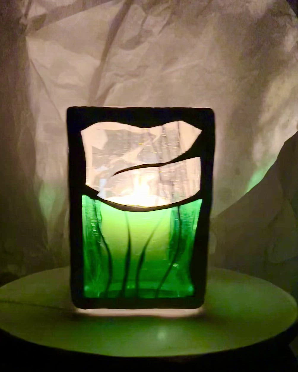 "Aquarium-Inspired Stained Glass Candleholder - Green & Crystal-Clear Glass with White Grout"