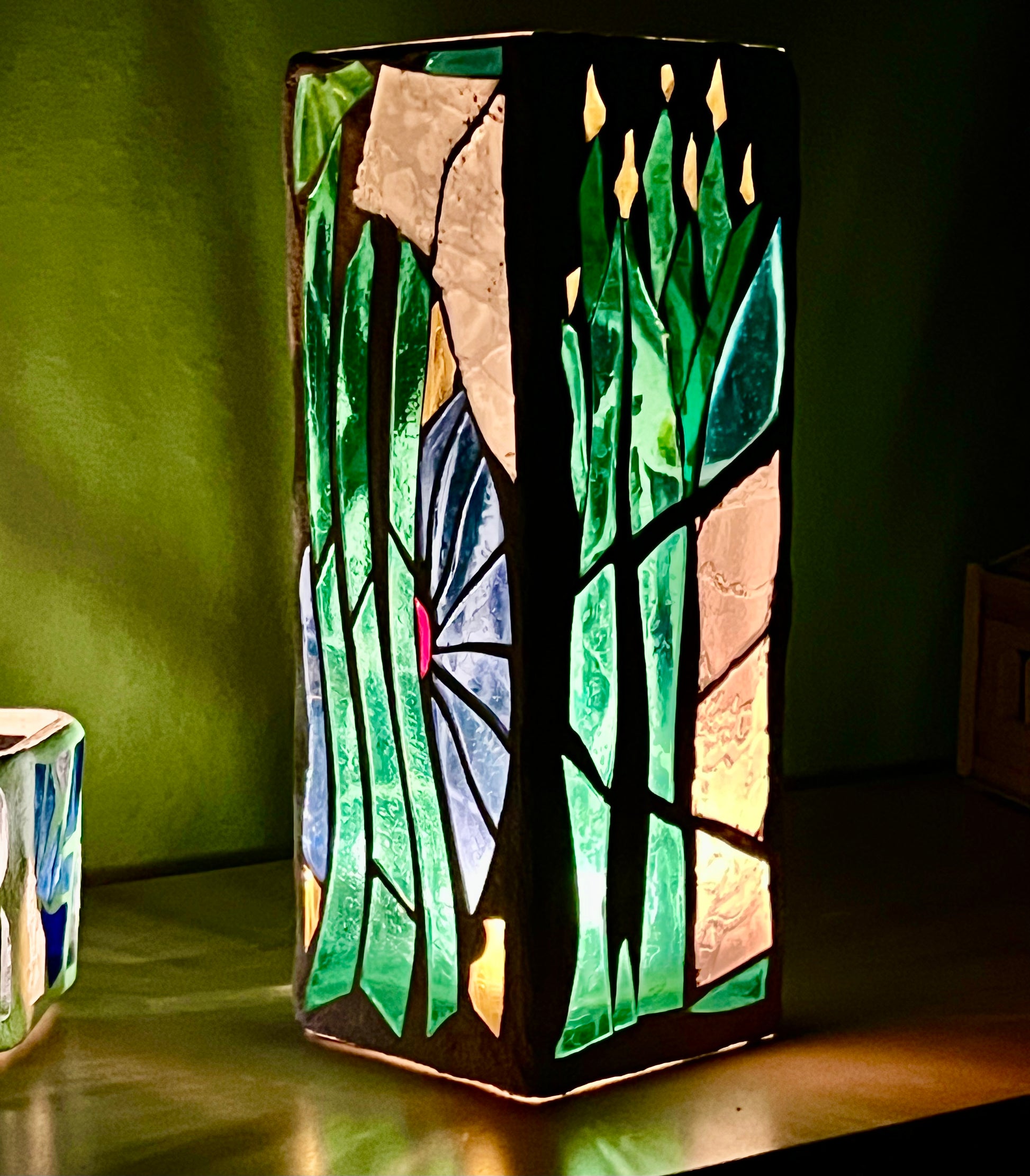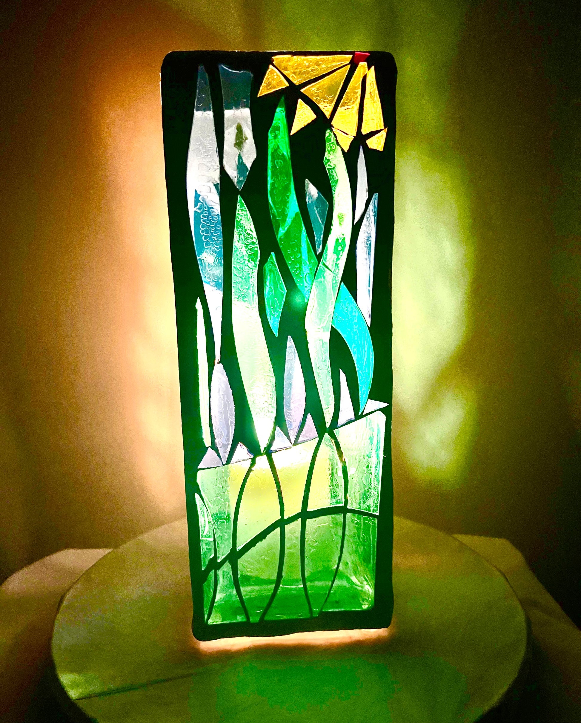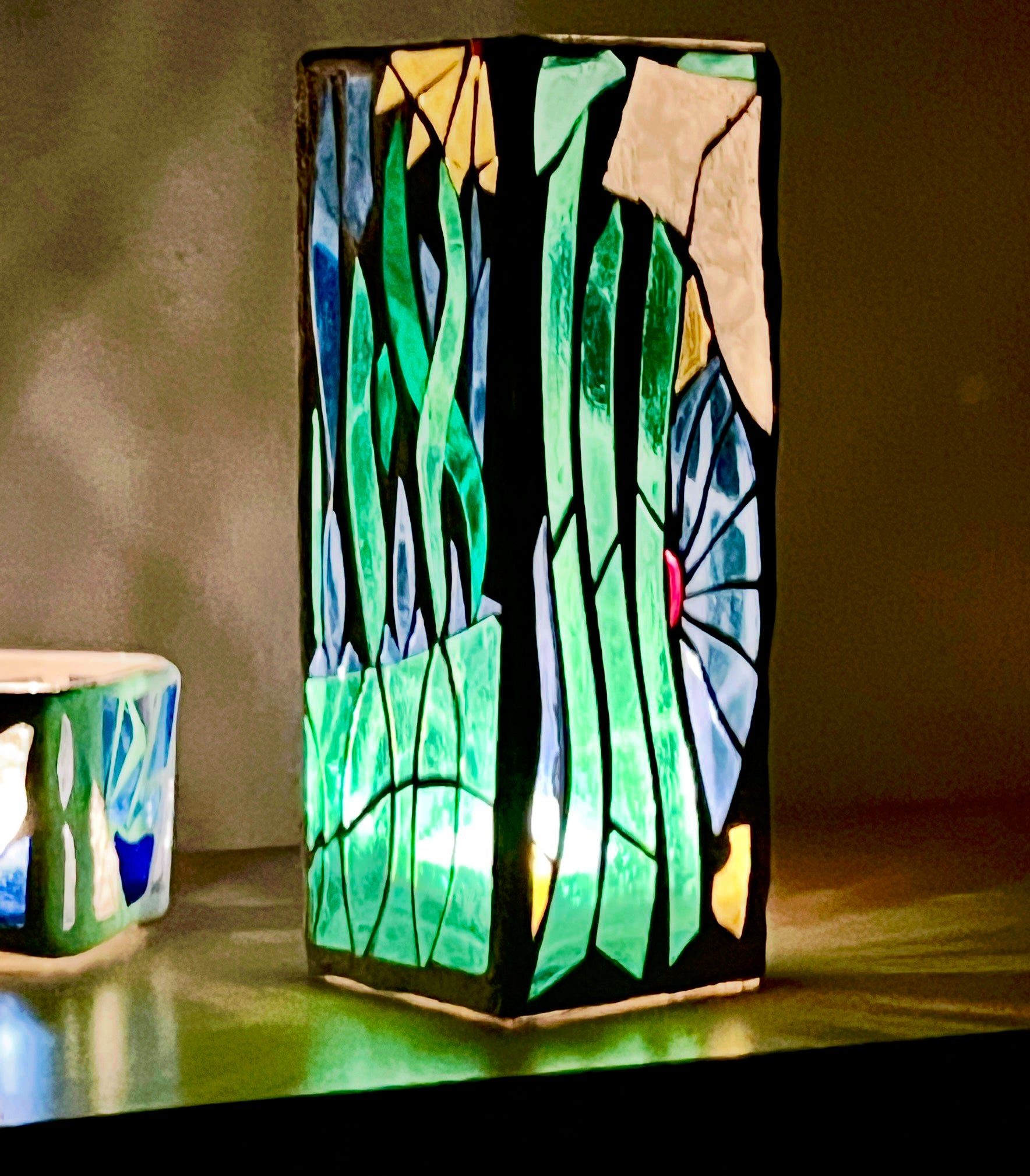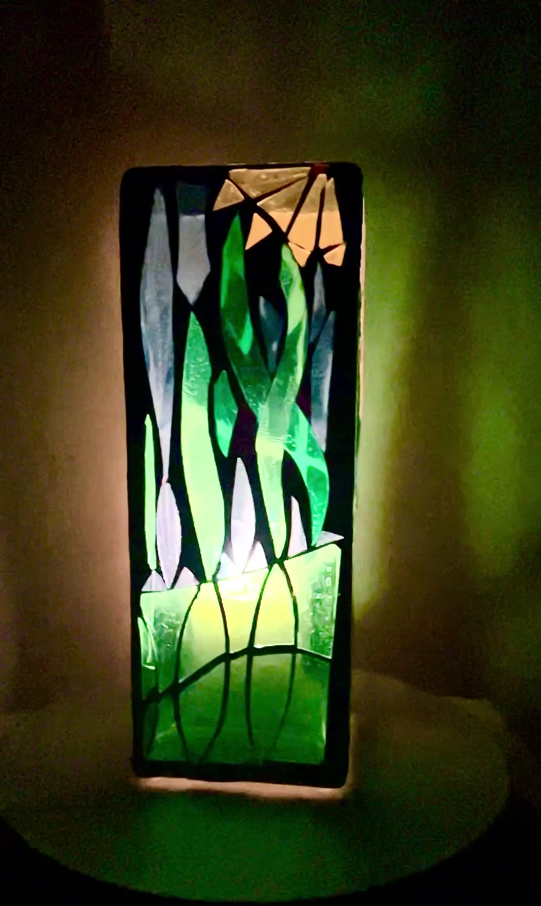 Standing 12 inches tall and 4 inches square, this piece is built from hand-cut stained glass in shades of green, blue, yellow, and clear crystal. The design flows upward like a living tree, with a little imagination.., with branches that transform into candle flames, giving the piece its name. Finished with bright white grout, the smooth, flowing lines invite light to calm your eyes and make you not think! or relax a bit at least.By day, sunlight streaming through its panels brings out the vibrant greens and blues, casting leafy reflections into the room. By night, the warm glow of a candle inside turns it into a radiant sculpture, alive with really beautiful colored light.