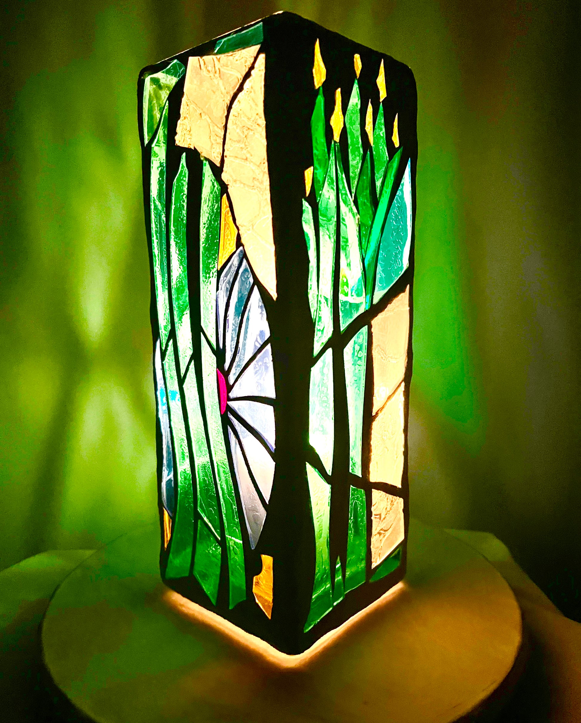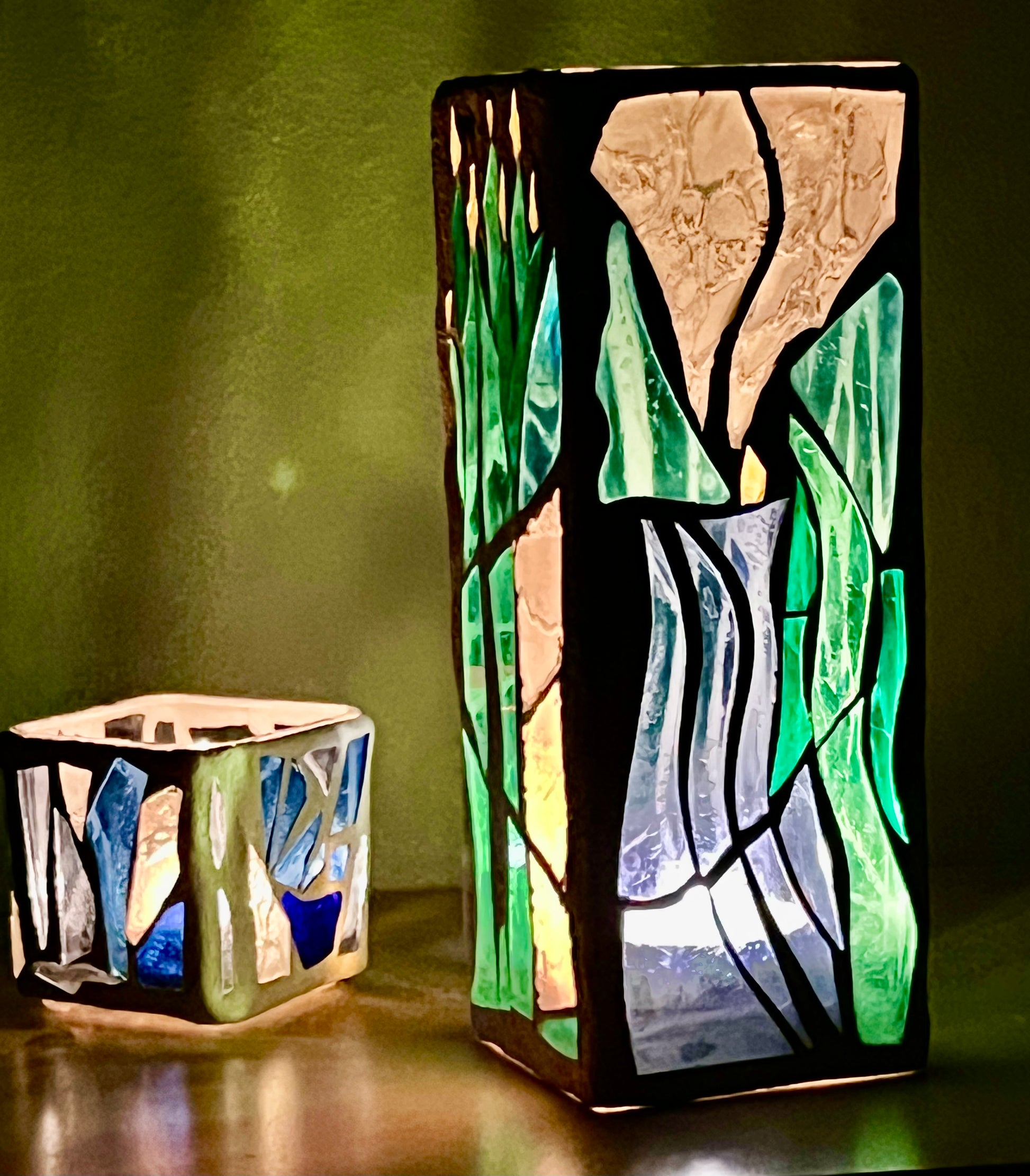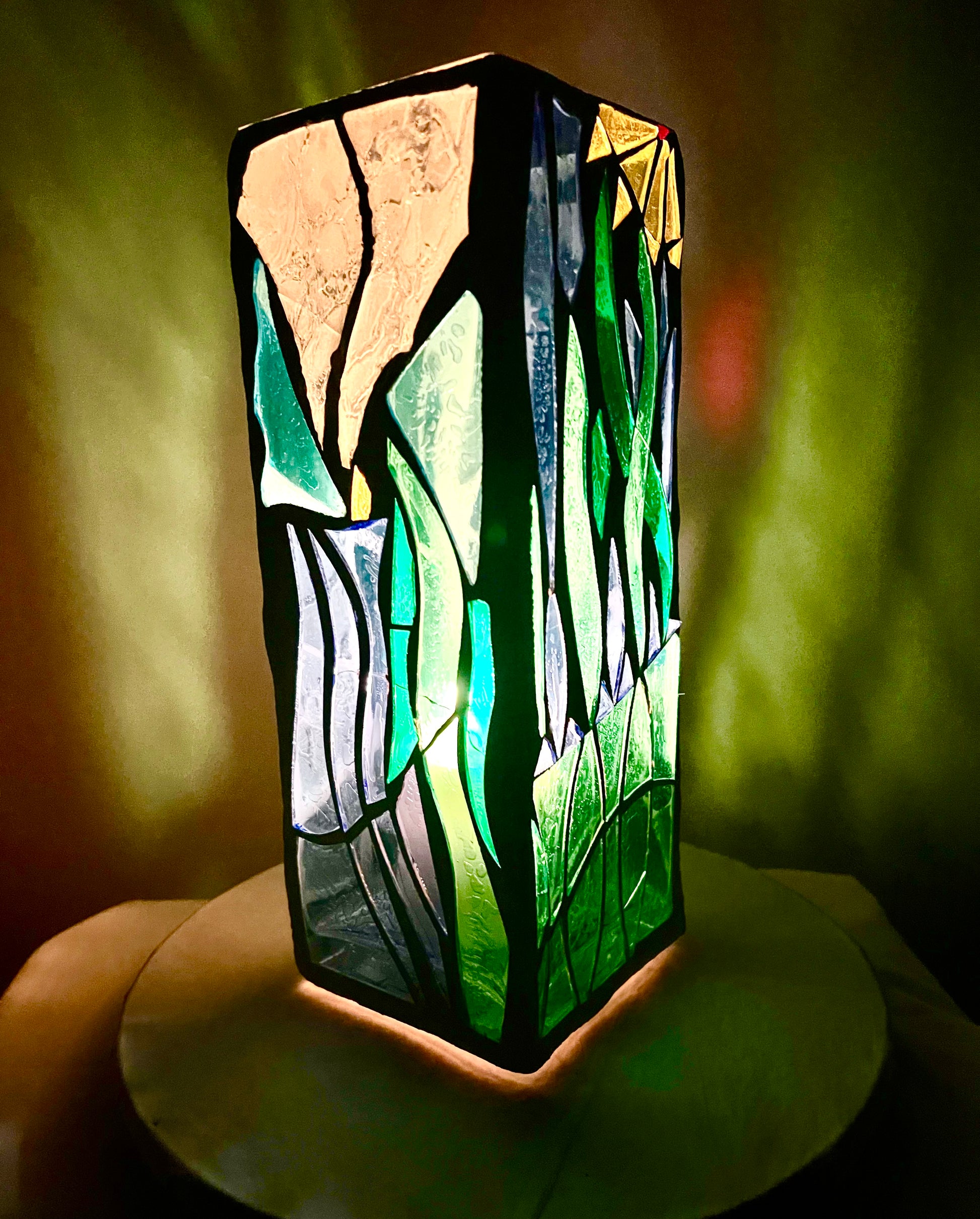 Standing 12 inches tall and 4 inches square, this piece is built from hand-cut stained glass in shades of green, blue, yellow, and clear crystal. The design flows upward like a living tree, with a little imagination.., with branches that transform into candle flames, giving the piece its name. Finished with bright white grout, the smooth, flowing lines invite light to calm your eyes and make you not think! or relax a bit at least.By day, sunlight streaming through its panels brings out the vibrant greens and blues, casting leafy reflections into the room. By night, the warm glow of a candle inside turns it into a radiant sculpture, alive with really beautiful colored light.