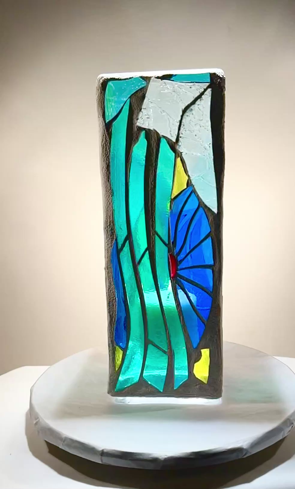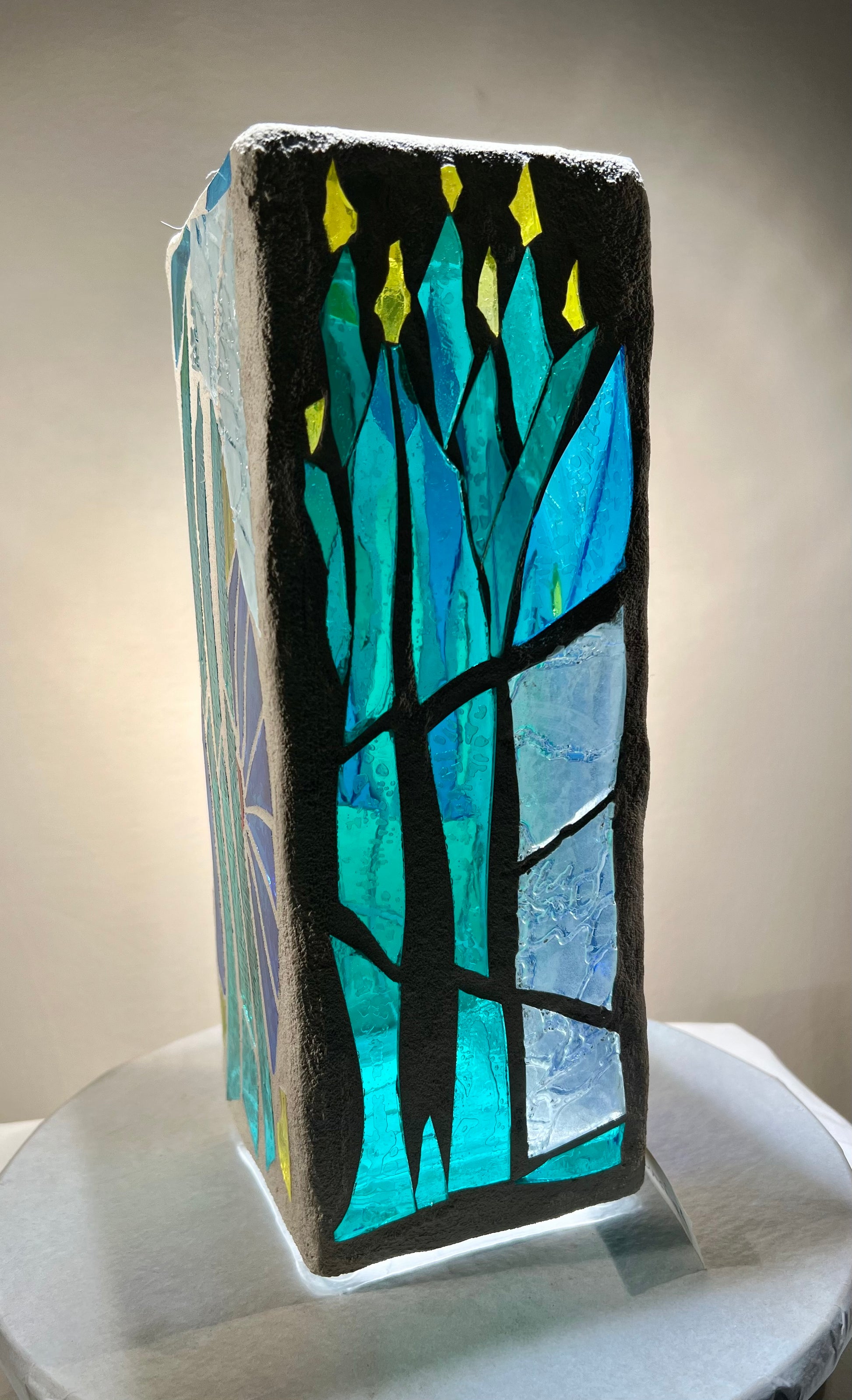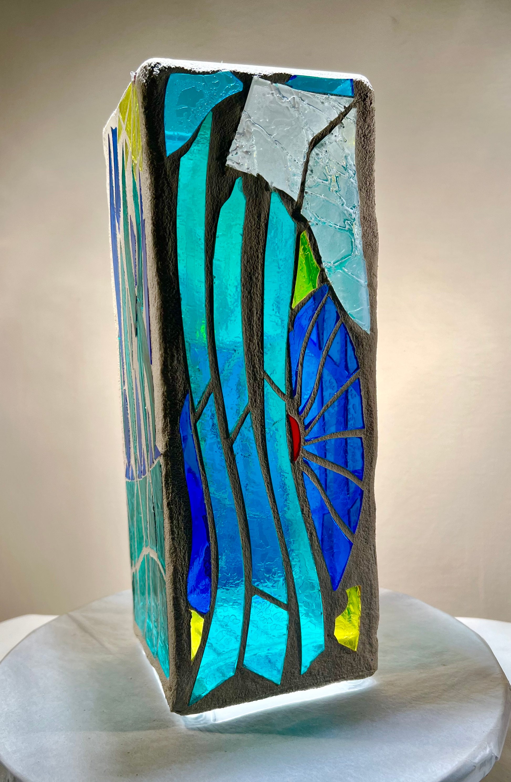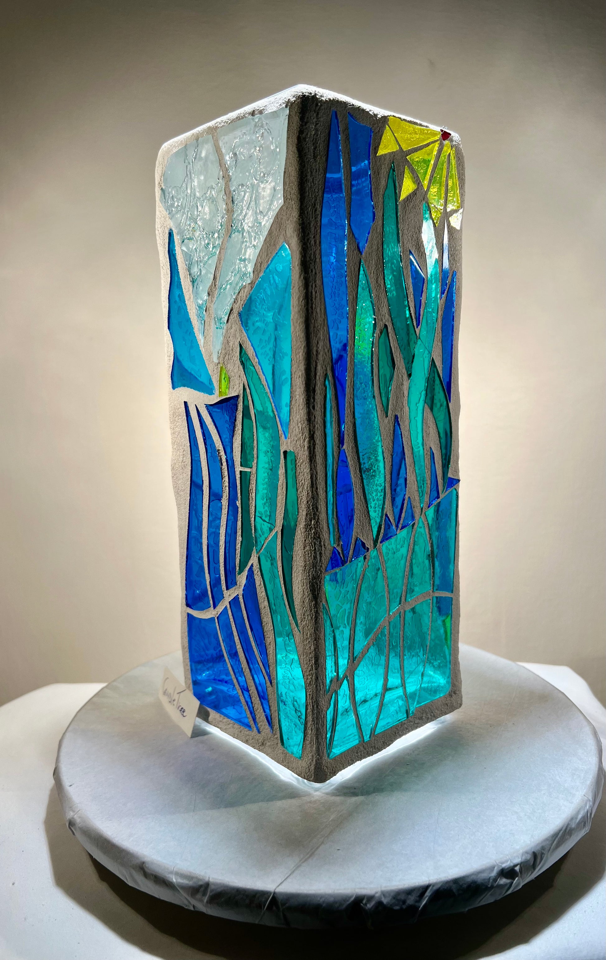 Standing 12 inches tall and 4 inches square, this piece is built from hand-cut stained glass in shades of green, blue, yellow, and clear crystal. The design flows upward like a living tree, with a little imagination.., with branches that transform into candle flames, giving the piece its name. Finished with bright white grout, the smooth, flowing lines invite light to calm your eyes and make you not think! or relax a bit at least.By day, sunlight streaming through its panels brings out the vibrant greens and blues, casting leafy reflections into the room. By night, the warm glow of a candle inside turns it into a radiant sculpture, alive with really beautiful colored light.