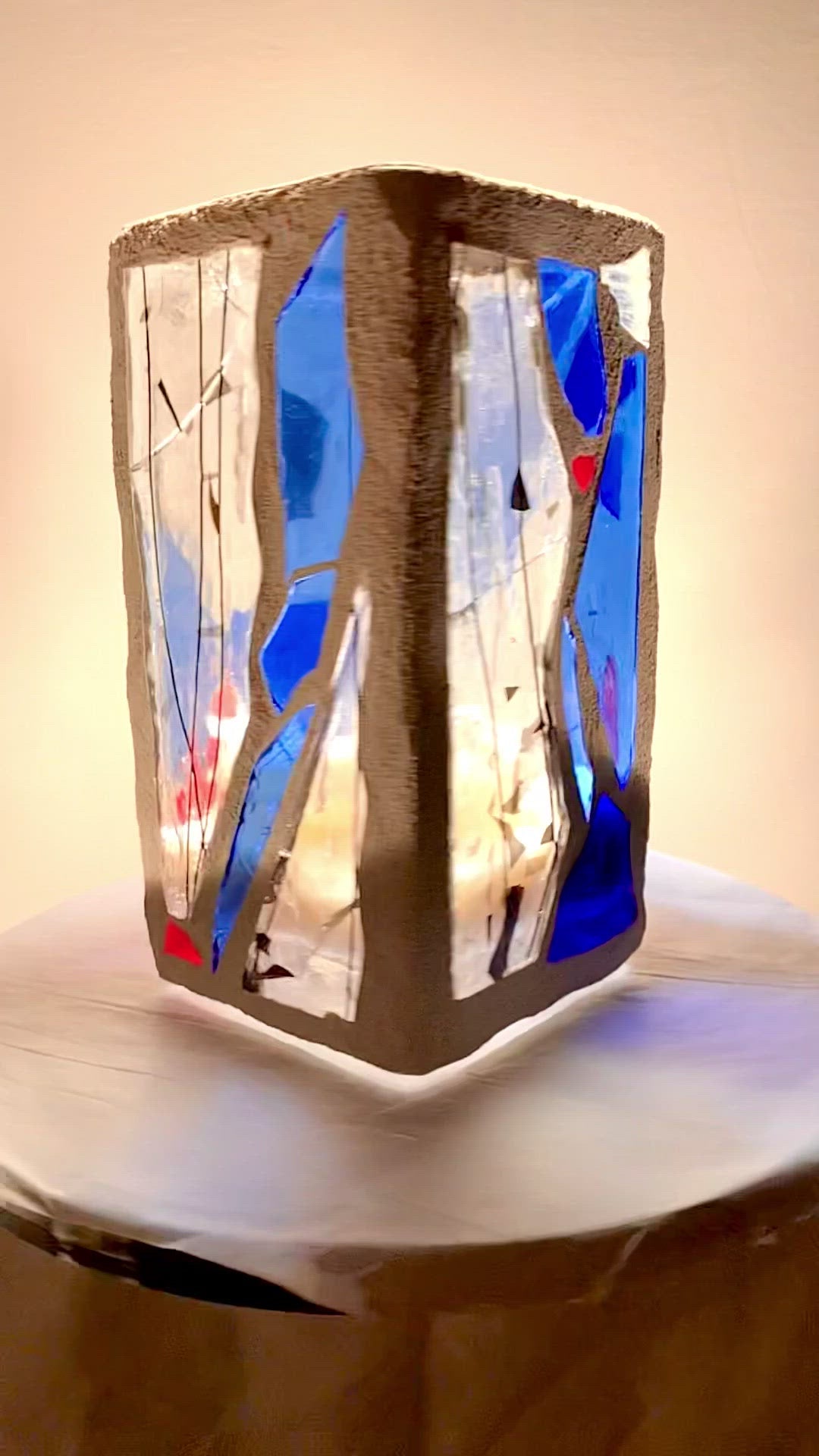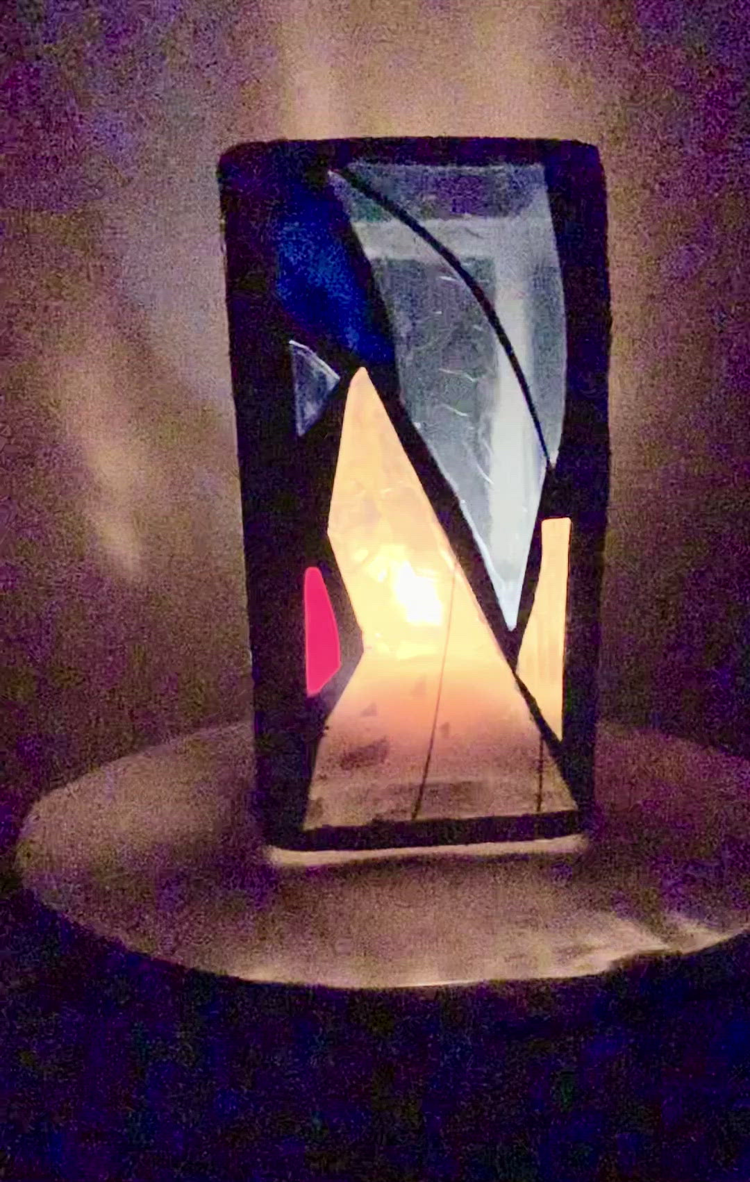 This 8" x 4" x 4" stained glass candleholder is handcrafted with beautiful blue, red, and black glass, finished with bright white grout for a striking contrast. It's a solid, one-of-a-kind piece that turned out to be pretty stunning, if I do say so myself!