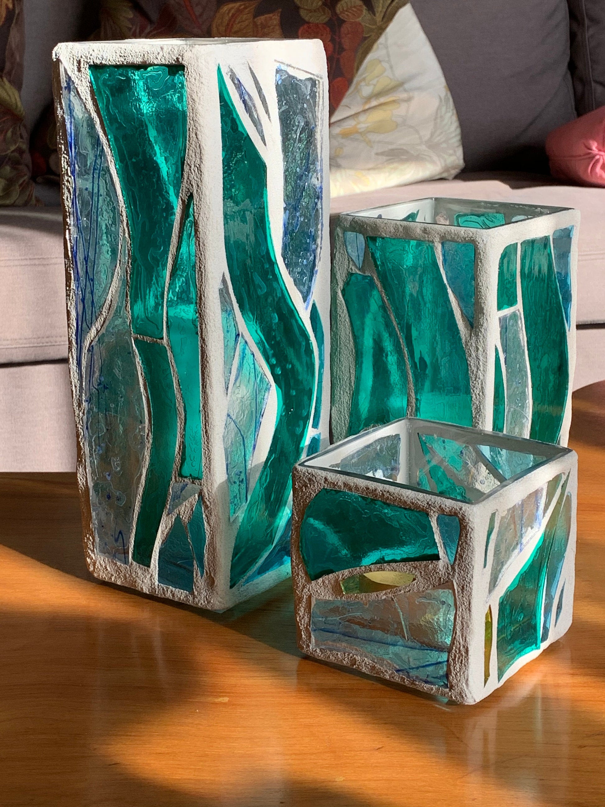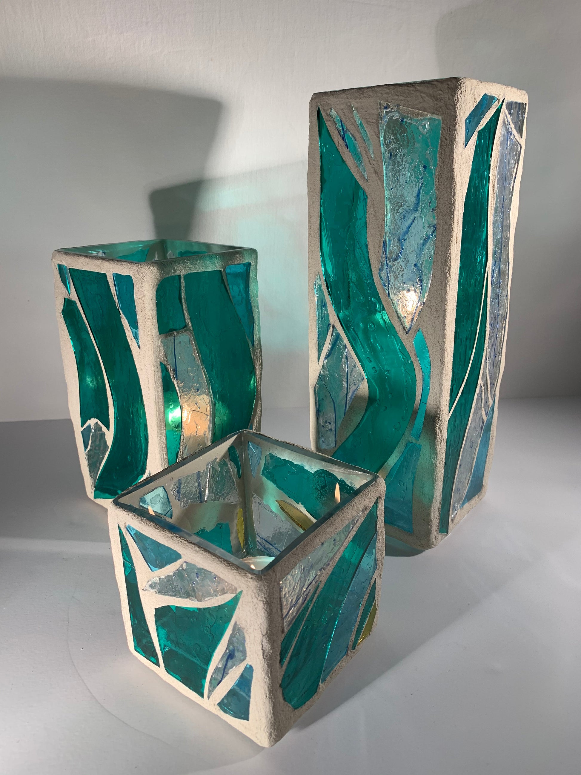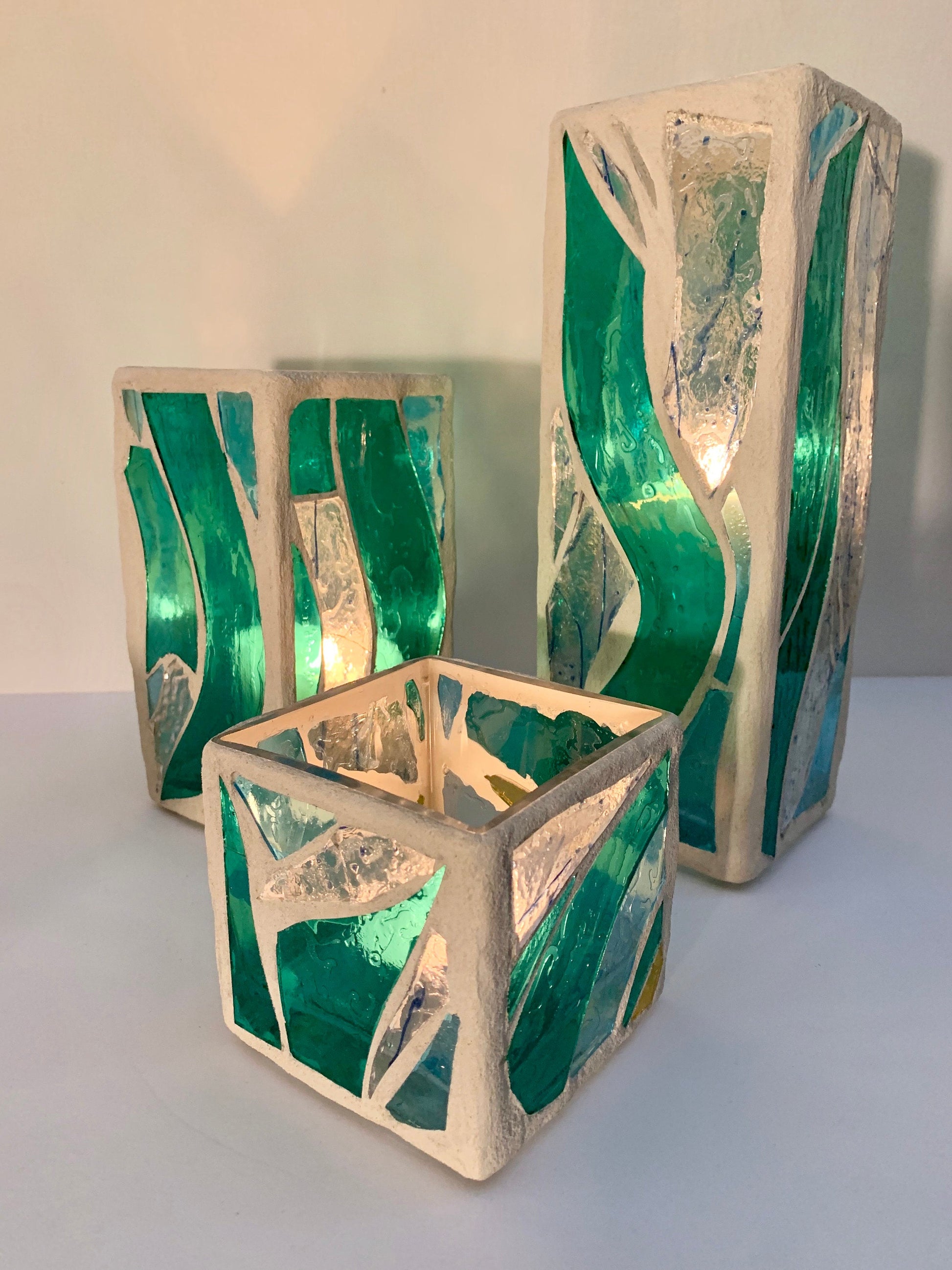 "The Three Sisters in Green" Cathedral Candleholders – A Unique Trio of Stained Glass Art