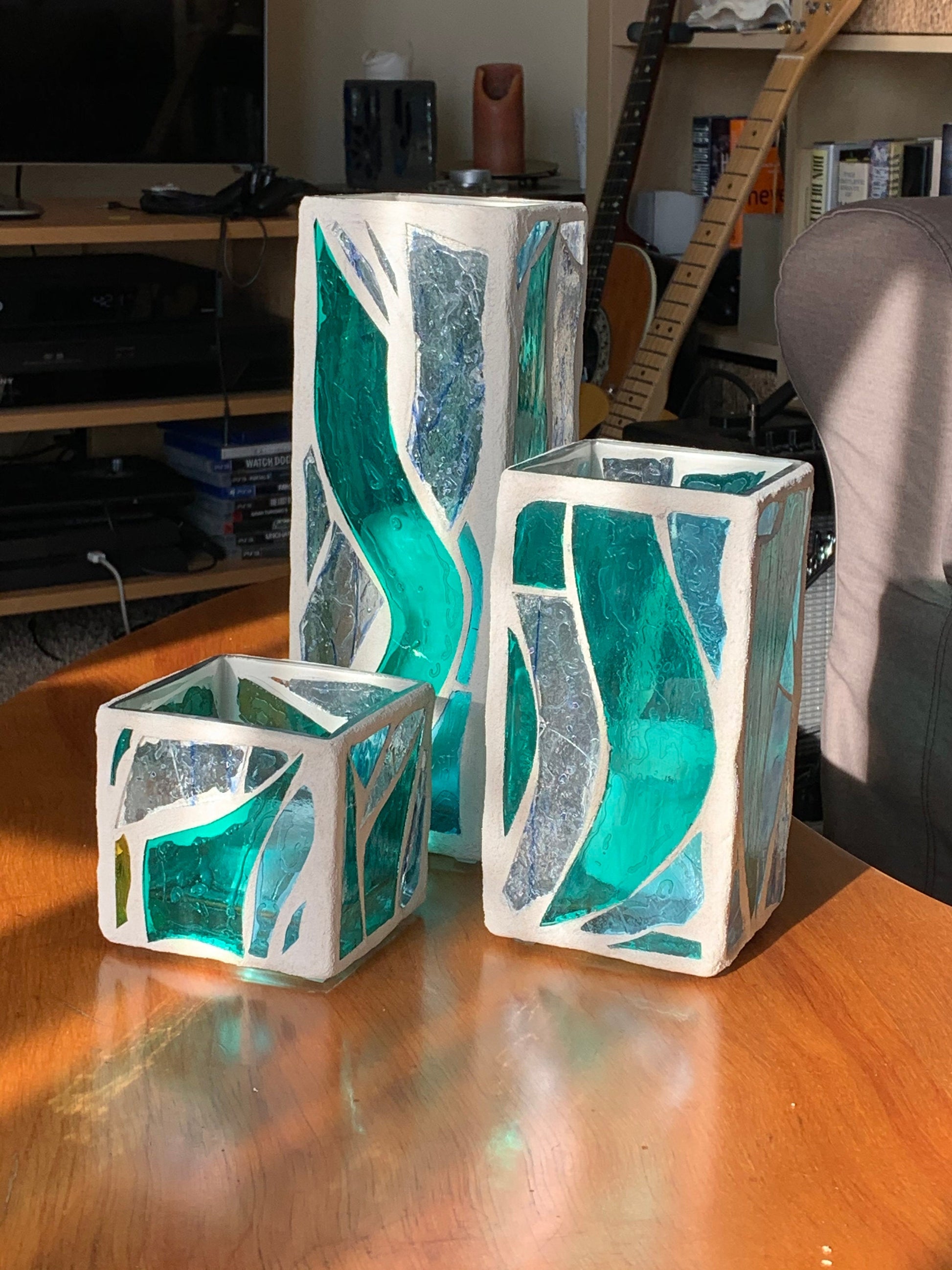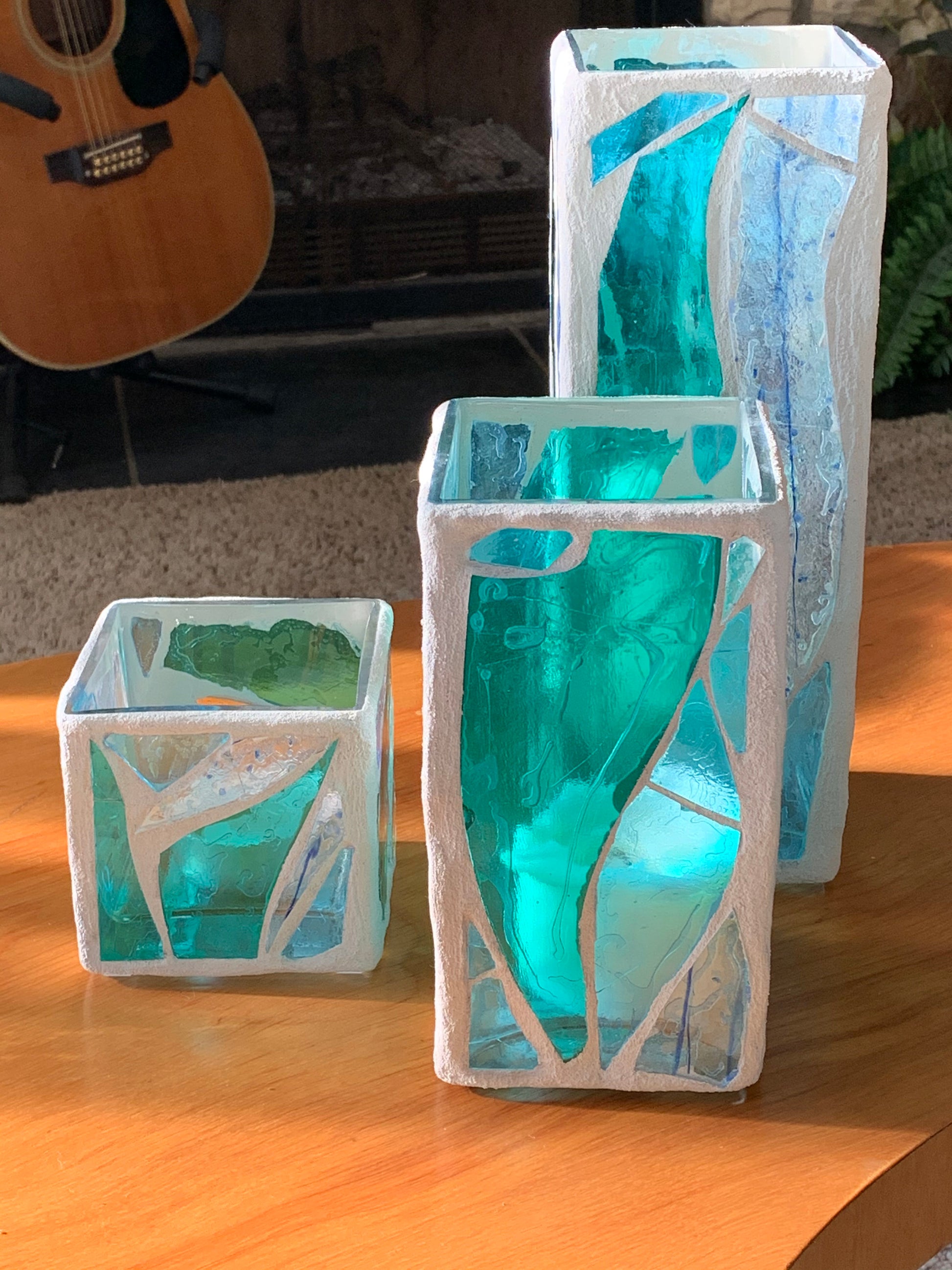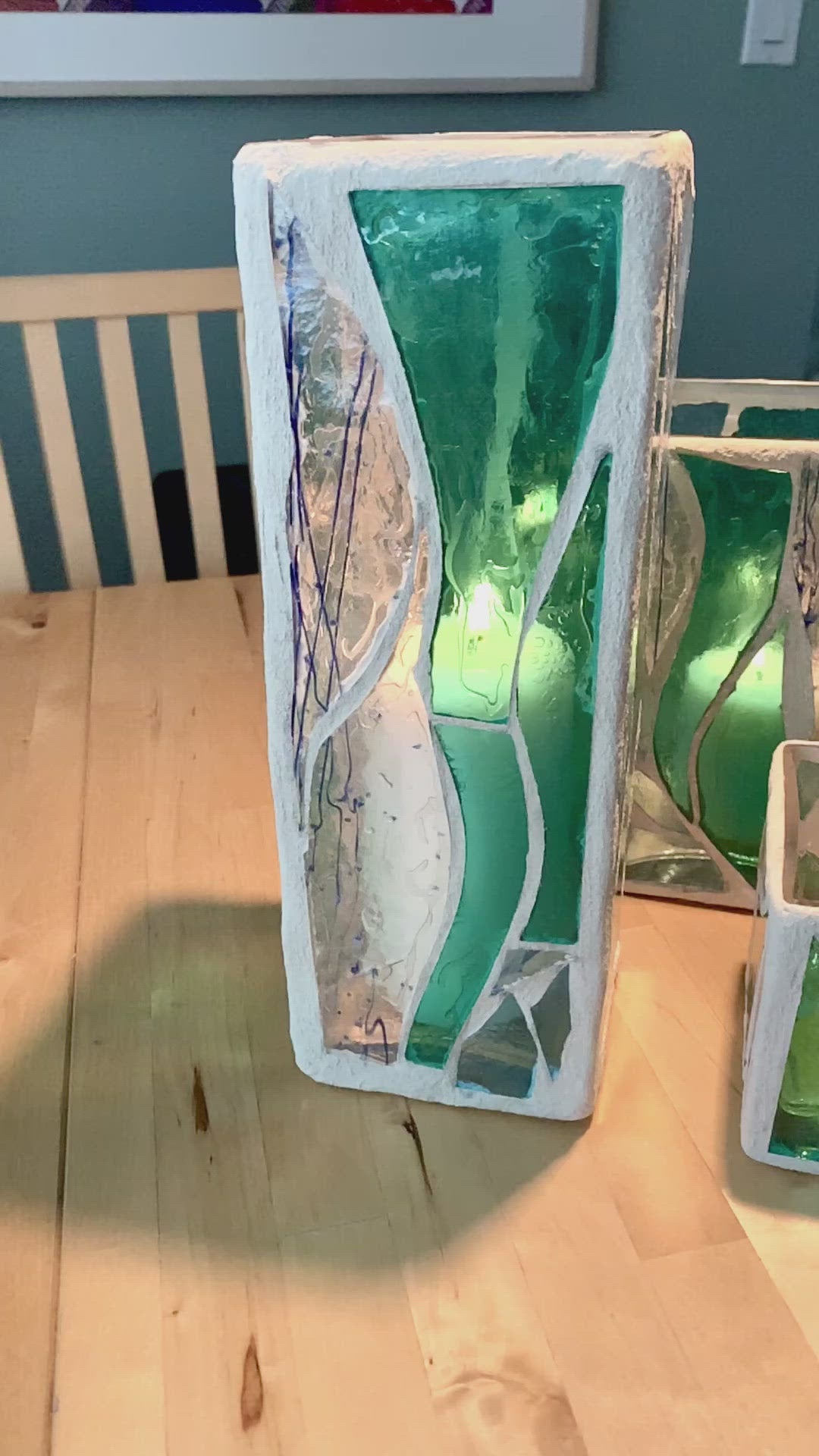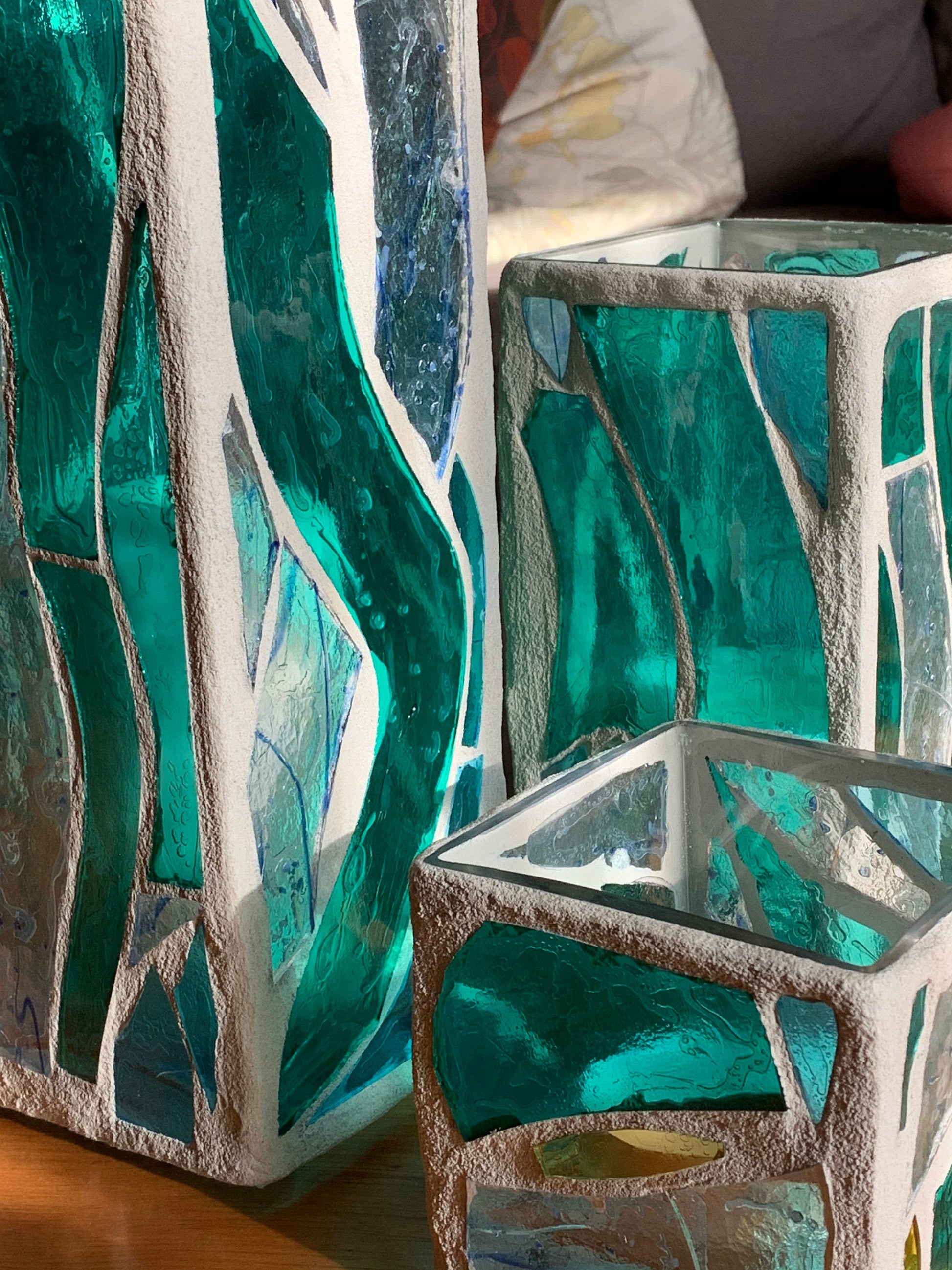 "The Three Sisters in Green" Cathedral Candleholders – A Unique Trio of Stained Glass Art