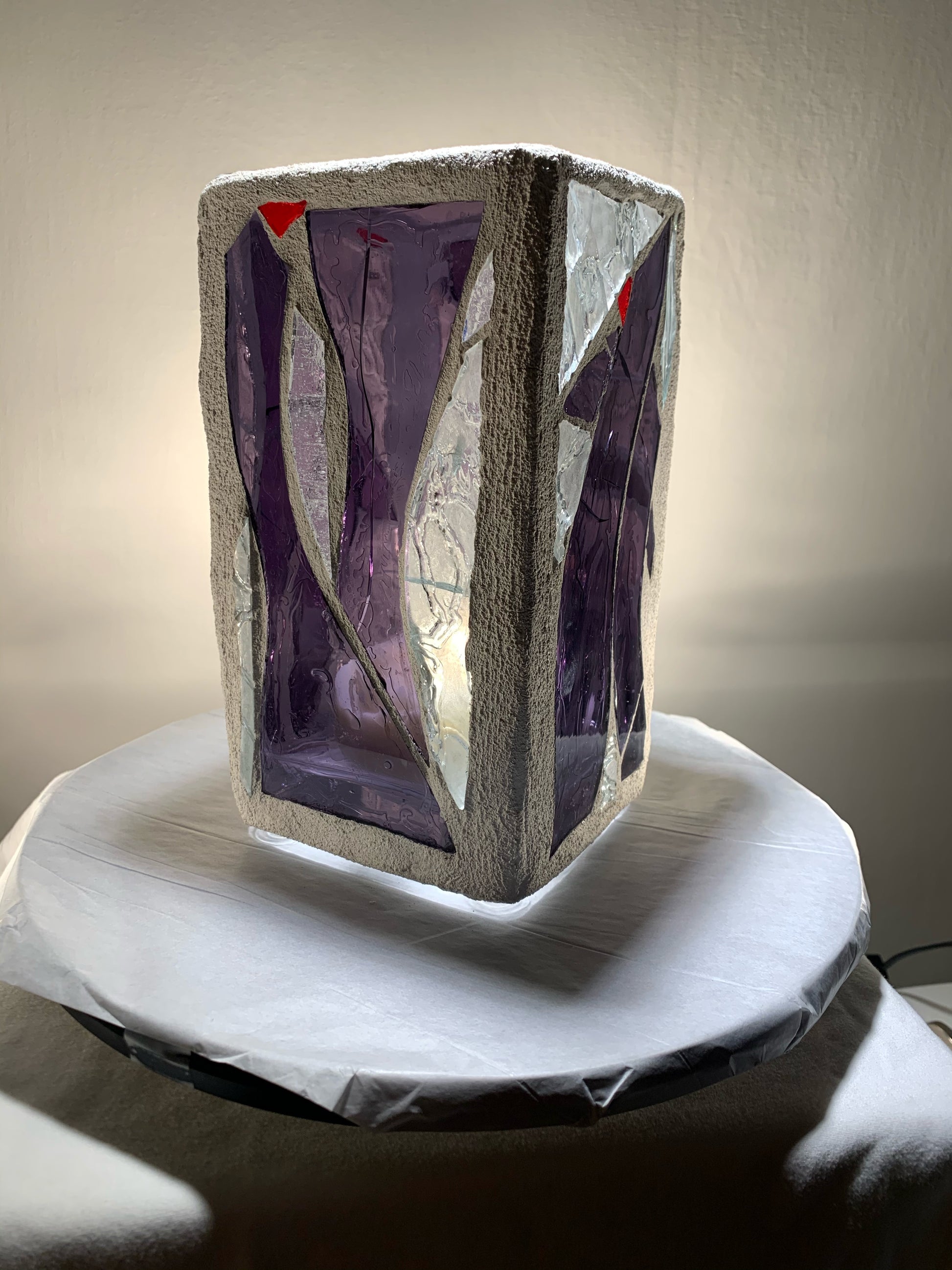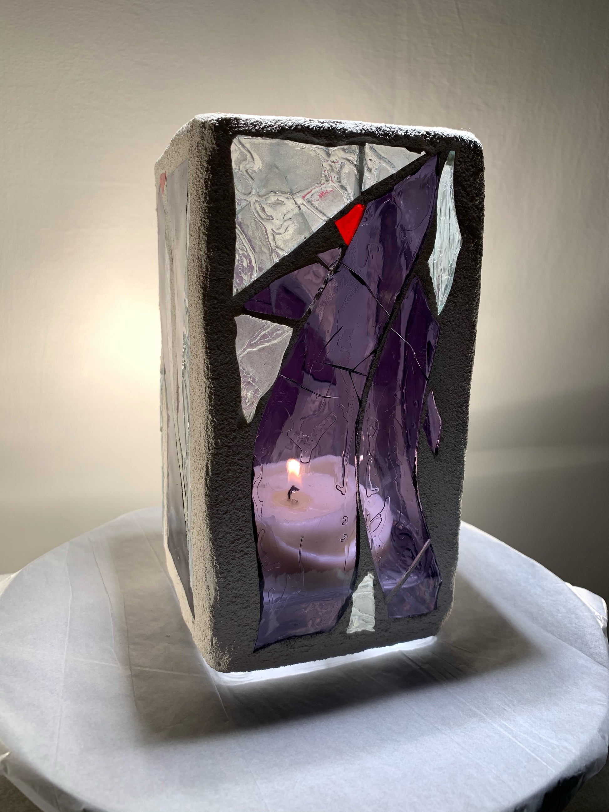 This candleholder stands 8 inches tall and is 4 inches square, made with a blend of purple, crystal clear, blue, and a touch of red stained glass, all finished with bright white grout. The colors come together beautifully, giving a sense of warmth and royalty—perfect for a piece named "Family"!