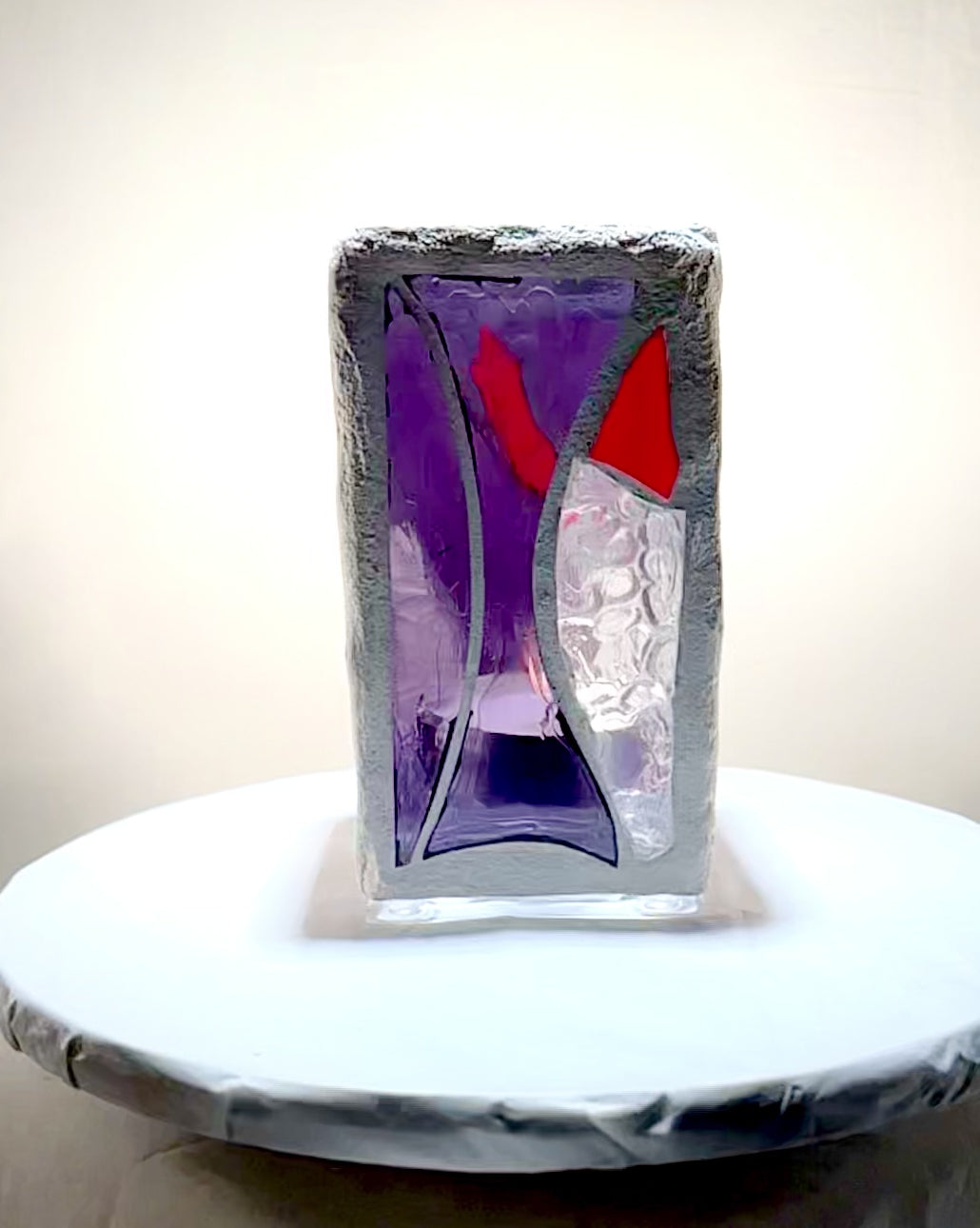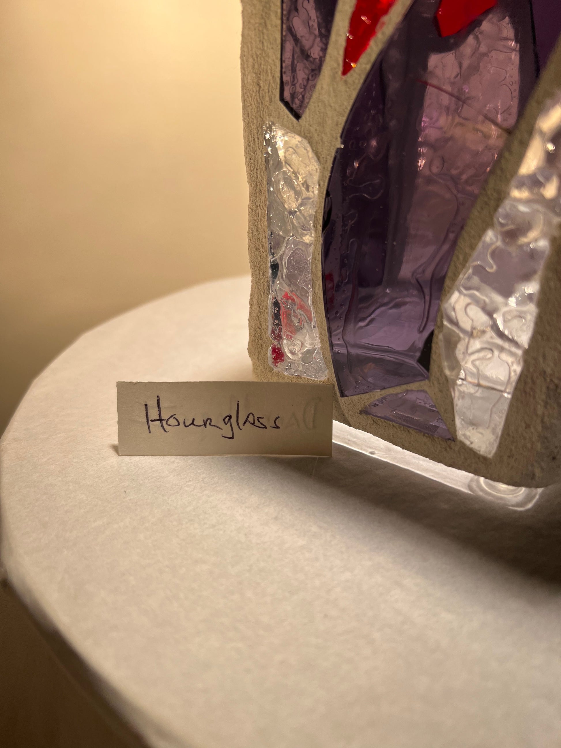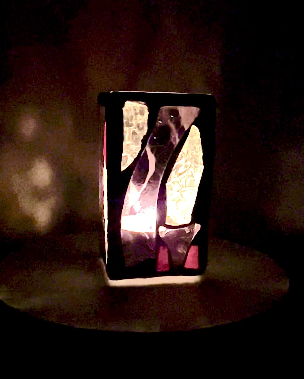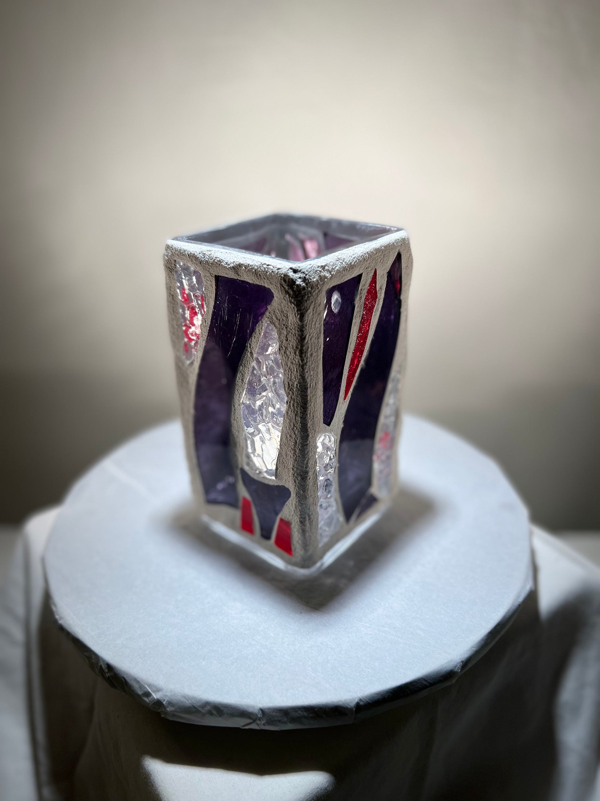 If you're admiring "Hourglass" from afar, don't worry—I can create an "artistically similar" version just for you, perhaps even with a "2" after its name. This candleholder is 6x3" and features a blend of purple, red, and crystal clear stained glass, finished with bright white grout. The inspiration for the name? A piece of glass that just happened to look like an hourglass—it’s funny how the little things shape the final creation!