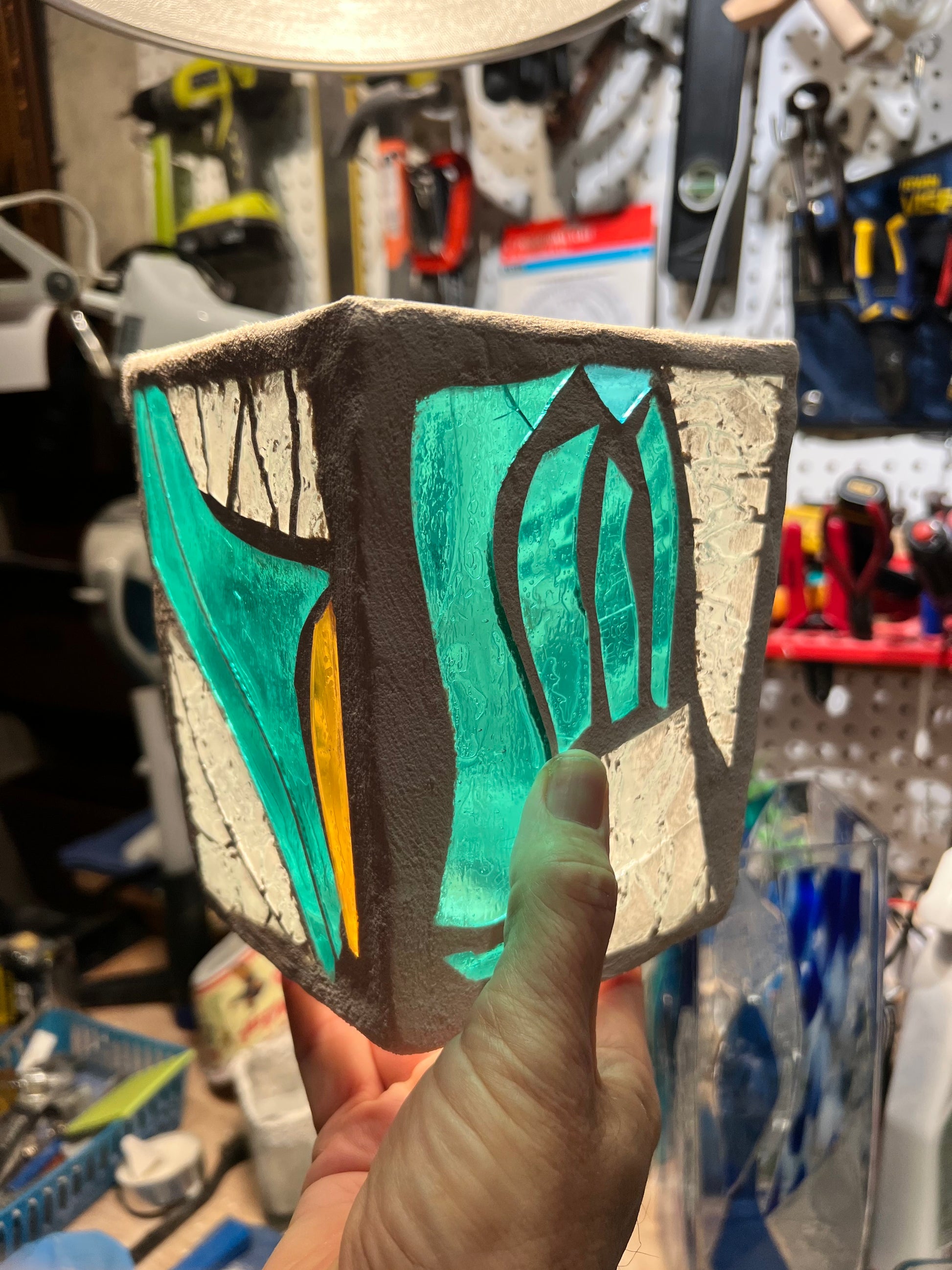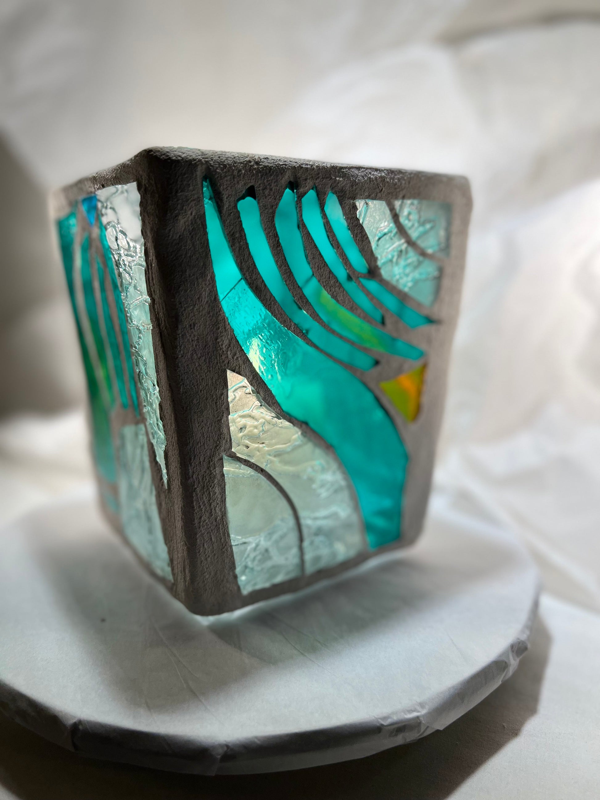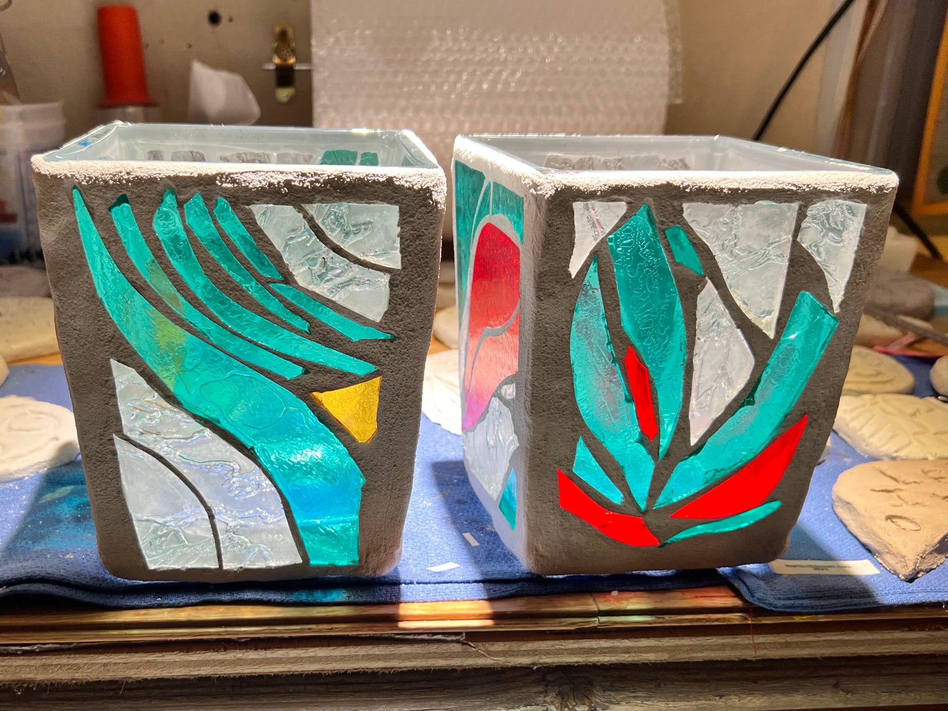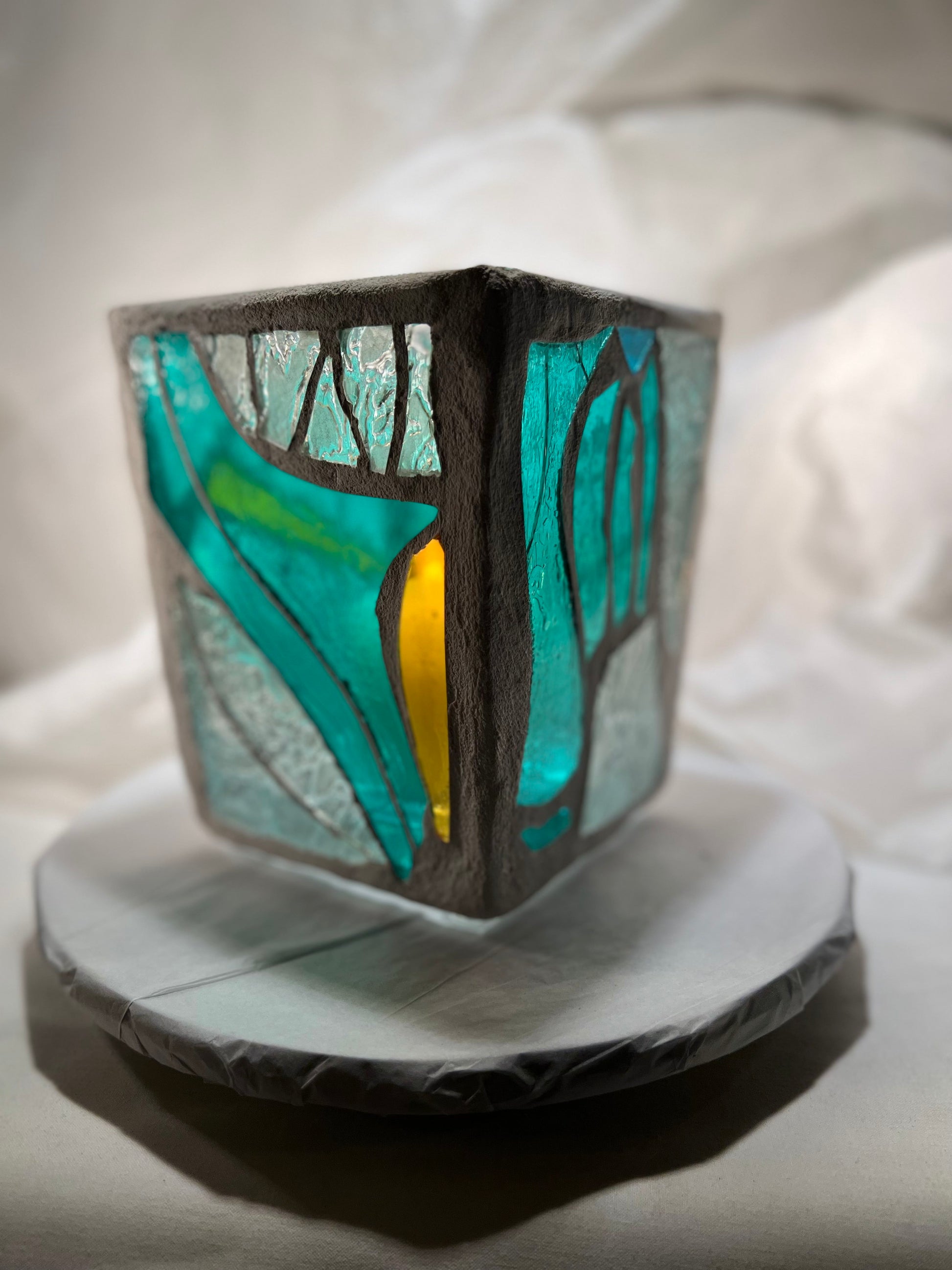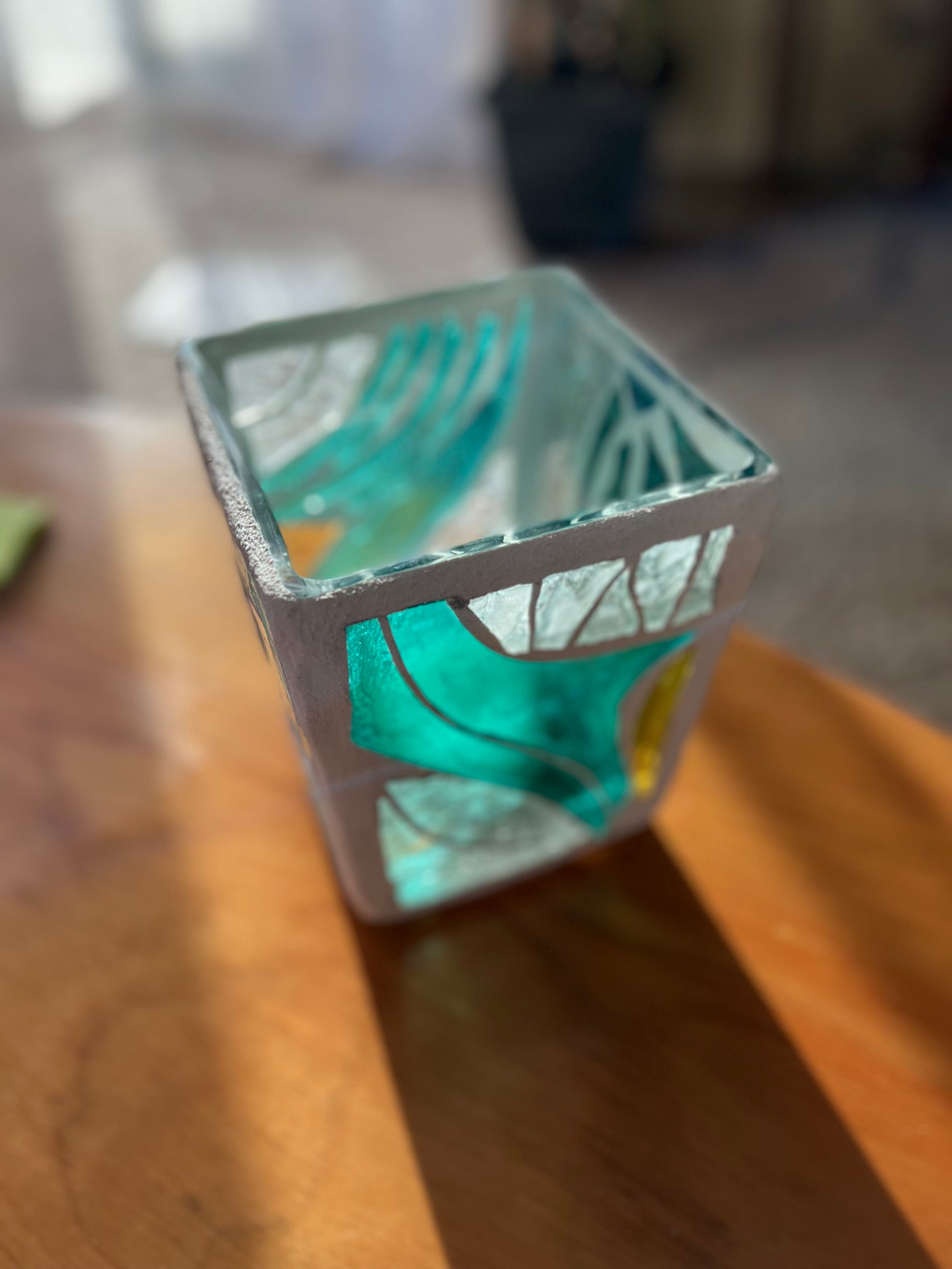 "Sail Away" got its name because the light green stained glass I used reminded me of a billowing sail catching the wind. This 7" vase tapers down to 5" at the base, and let me tell you, when I found these heavy vases in a glass store, I just knew I had to have them! They seemed perfect for a big dinner table or as patio lights — the two together, of course. But now that they’ve transformed into candleholders, they've decided to sail their own course and go separate ways. And you know what? That’s fine (sniff)... I’ll be OK!