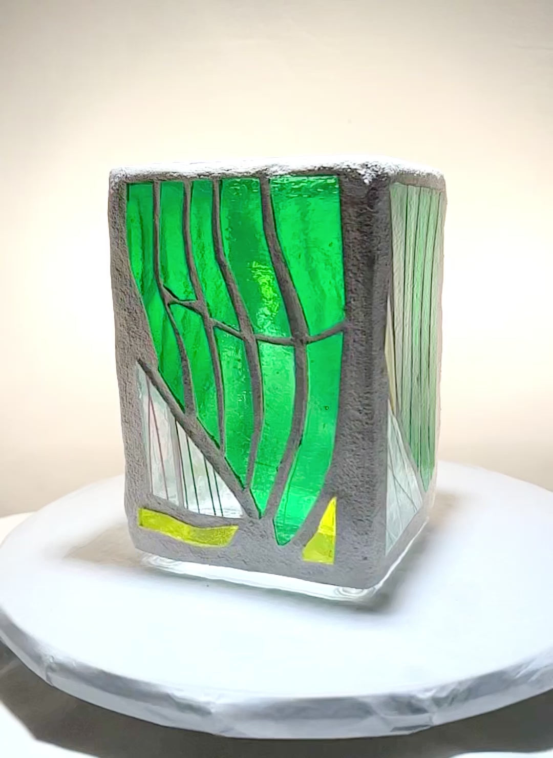 "Stalactite ll" Stained glass-candleholder, green, and crystal-clear glass, white grout, Cathedral Candles
