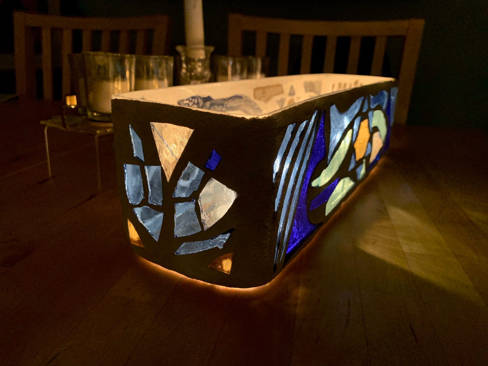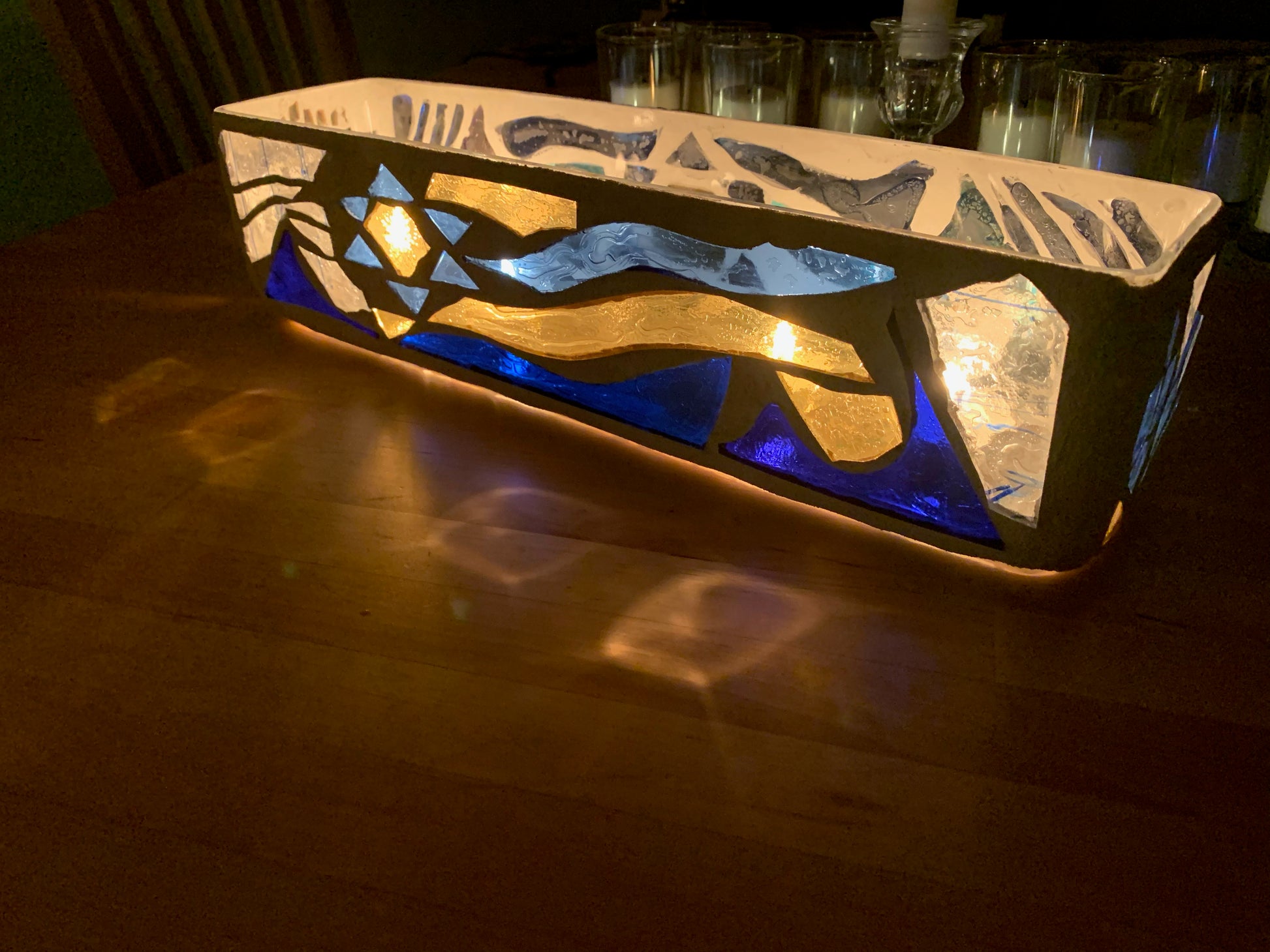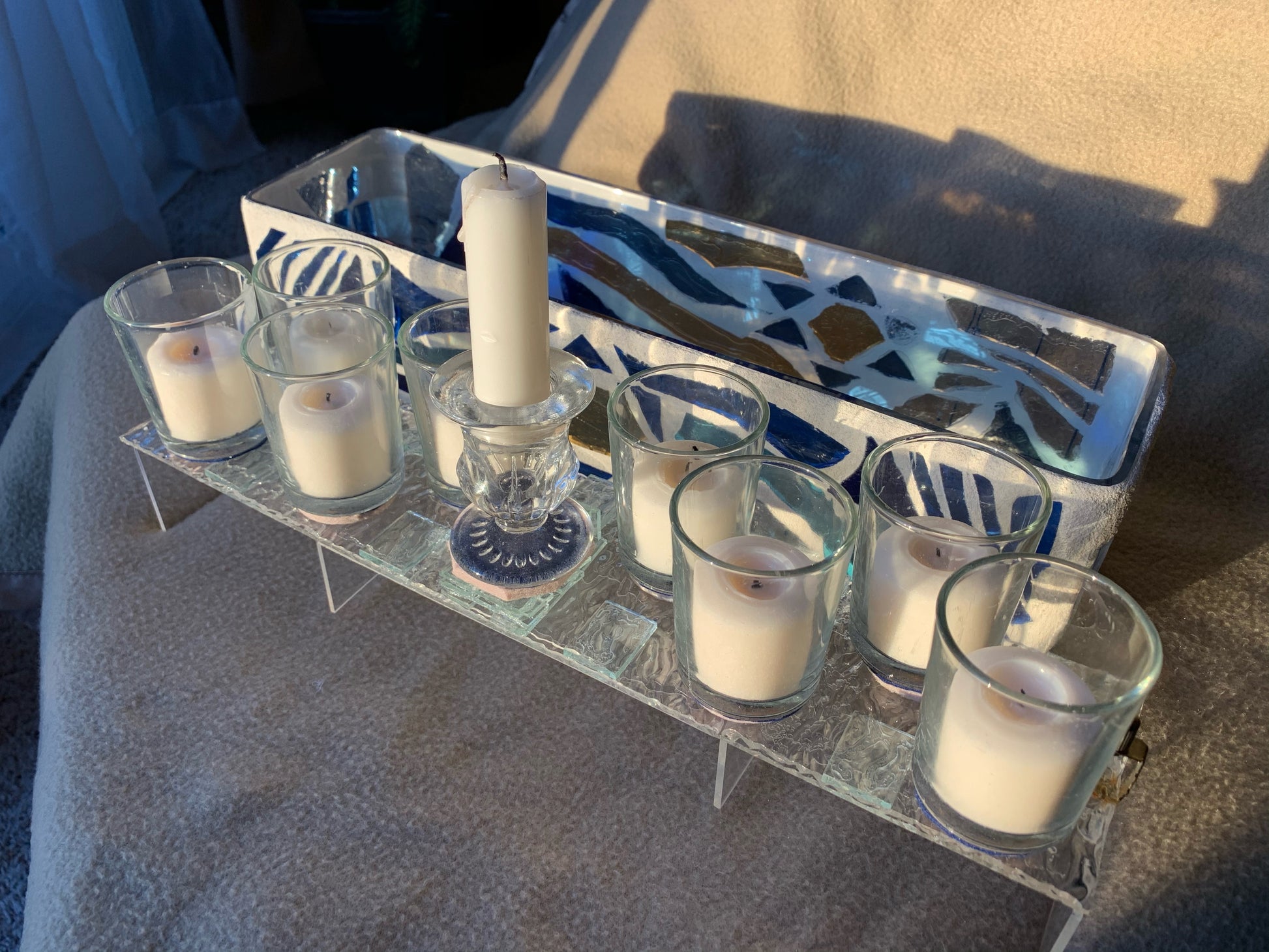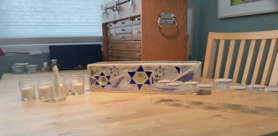 At the centerpiece, a removable candle riser made of glass and clear vinyl holds eight votive candles and one taper candle for the "helper" or shamash. This unique design elevates the candles, creating a stunning display while making them easy to light. When not in use for Hanukkah, the insert can be stored, transforming the menorah into an elegant candleholder that illuminates the beautiful blue and gold stained glass throughout the year.
