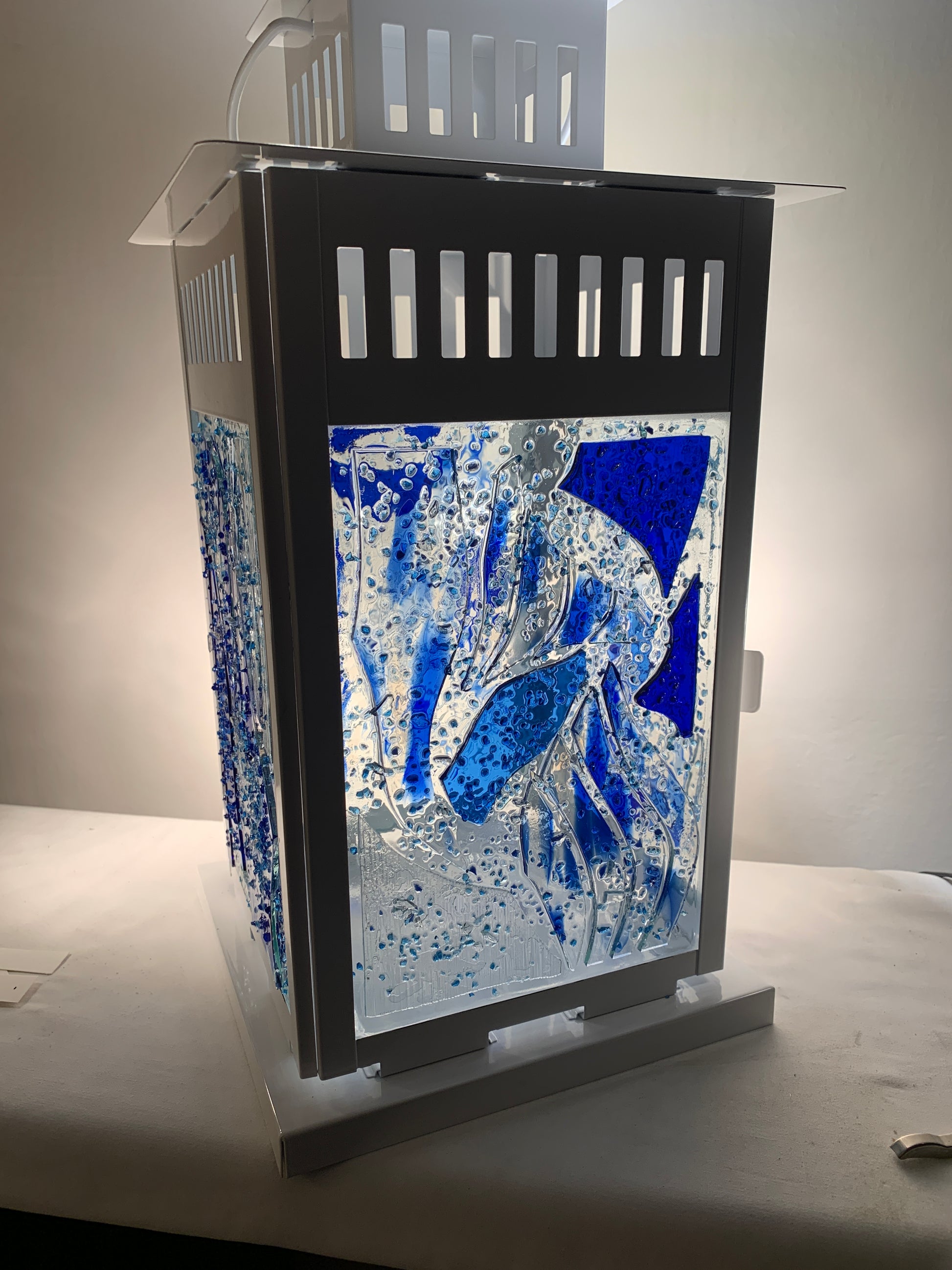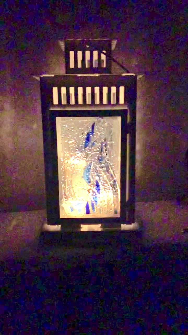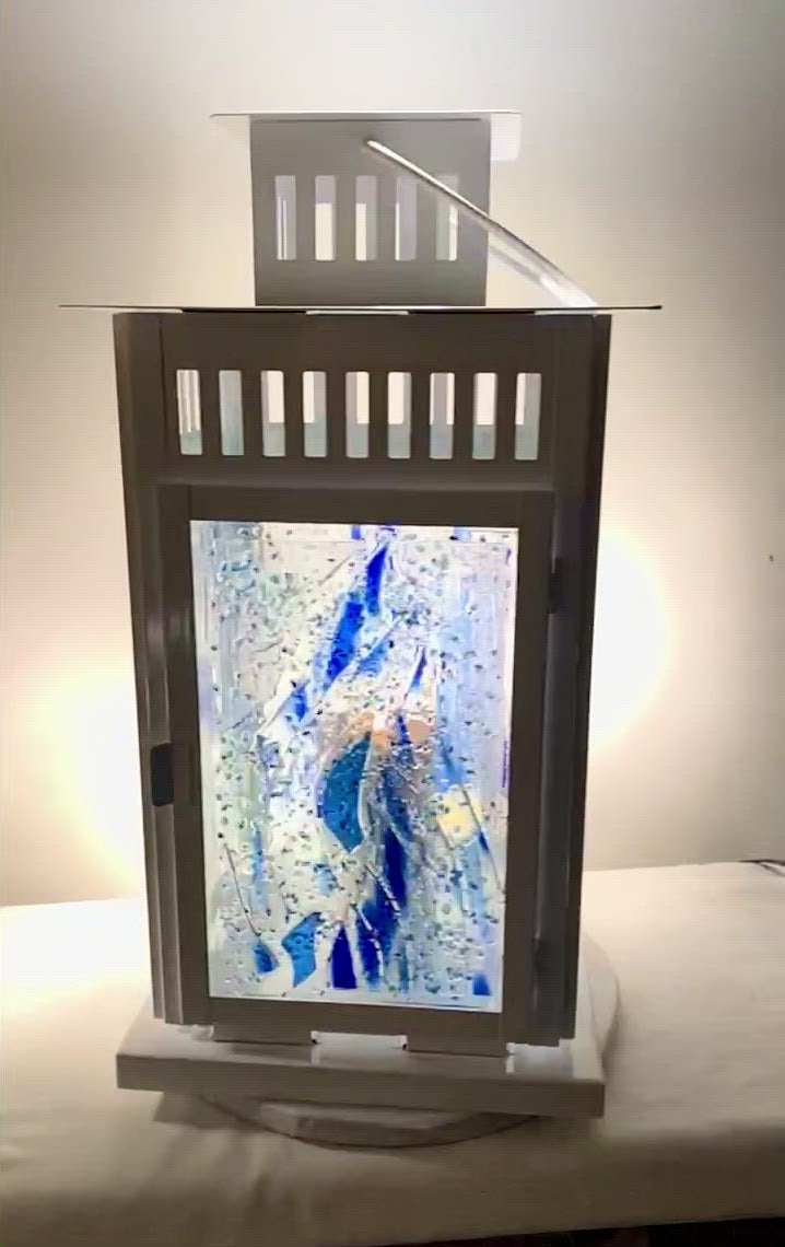 Discover the unique charm of the "Blue Flame" stained glass lantern. I found a remarkable sheet of glass that appeared multicolored from afar, but up close revealed stunning shades of blue. Inspired by the flame-like patterns in the glass, I crafted this lantern to capture its dynamic beauty.