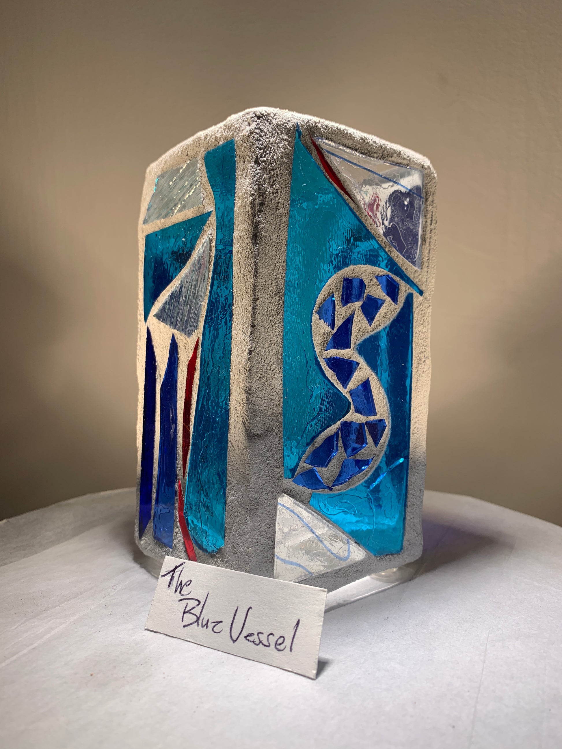 "Blue Vessel" Stained glass candleholder , blue, a little red, and crystal clear glass, bright white grout