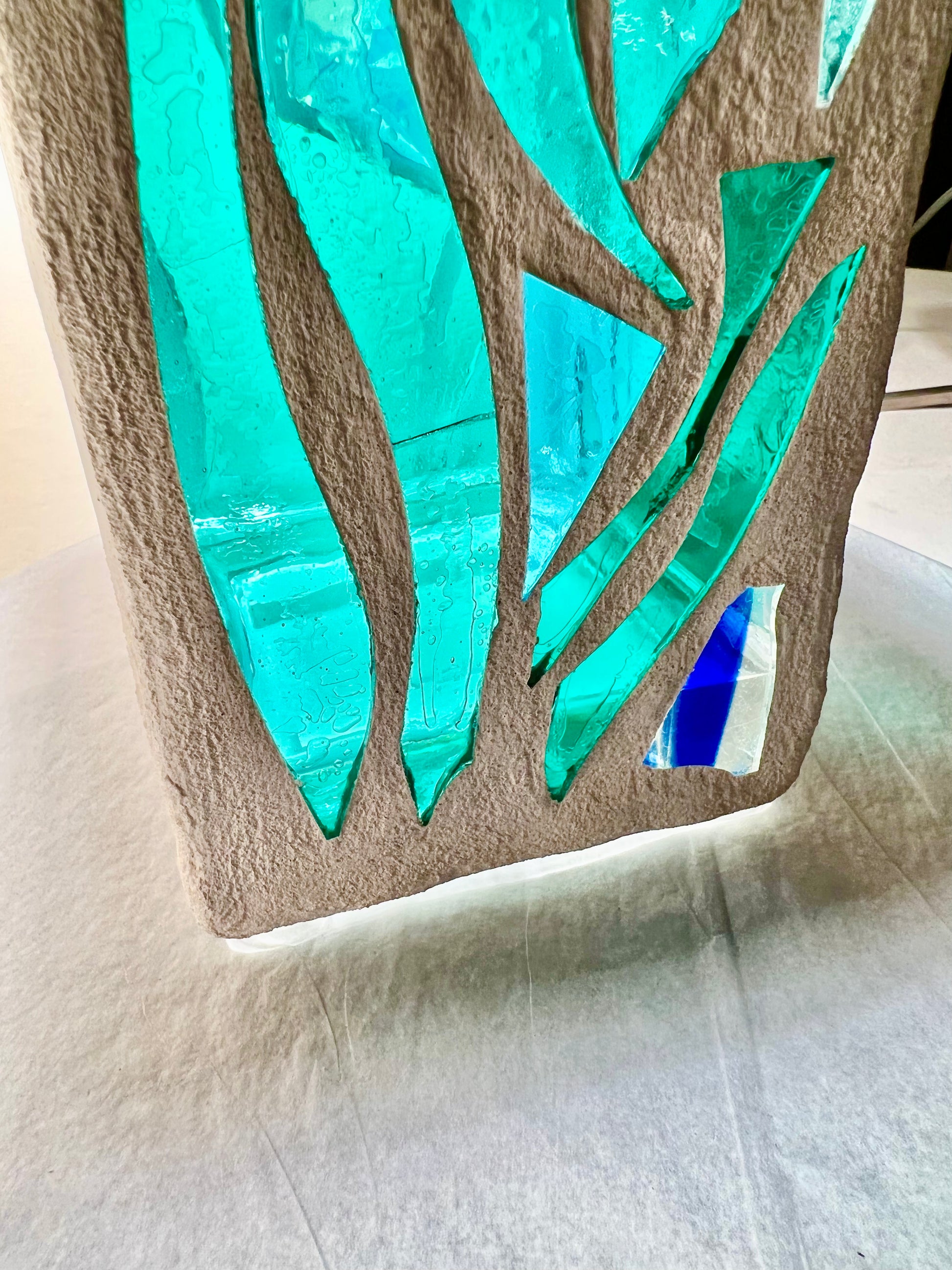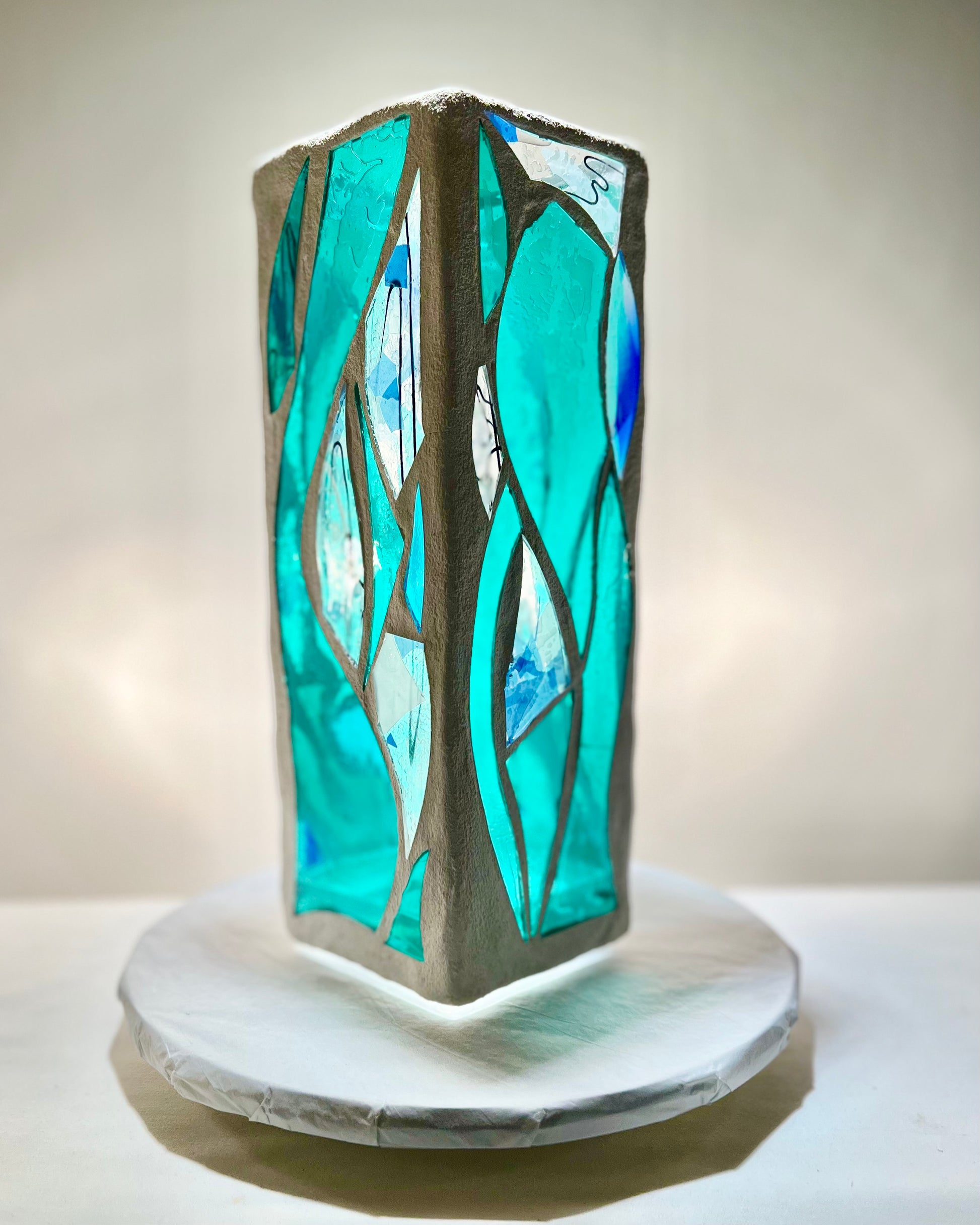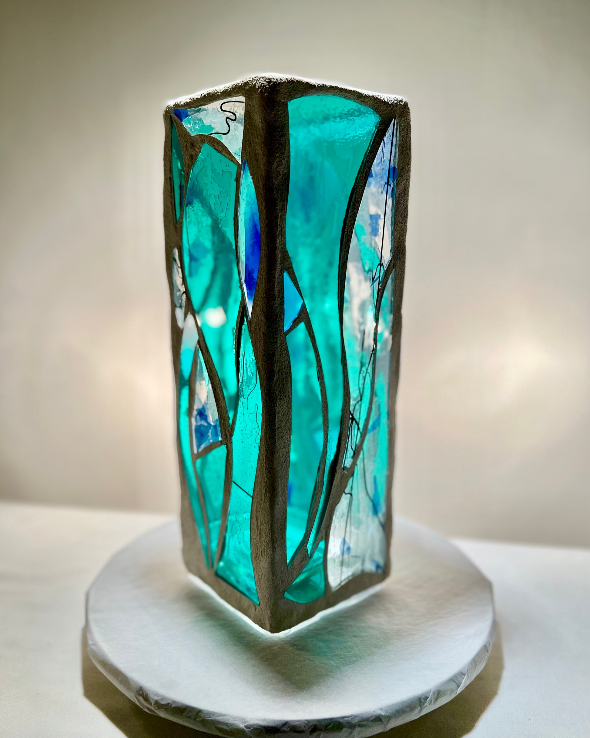 "Big Green Sister OHO" Stained Glass Candle Holder – Green and Blue Glass with White Grout, 12x4x4”