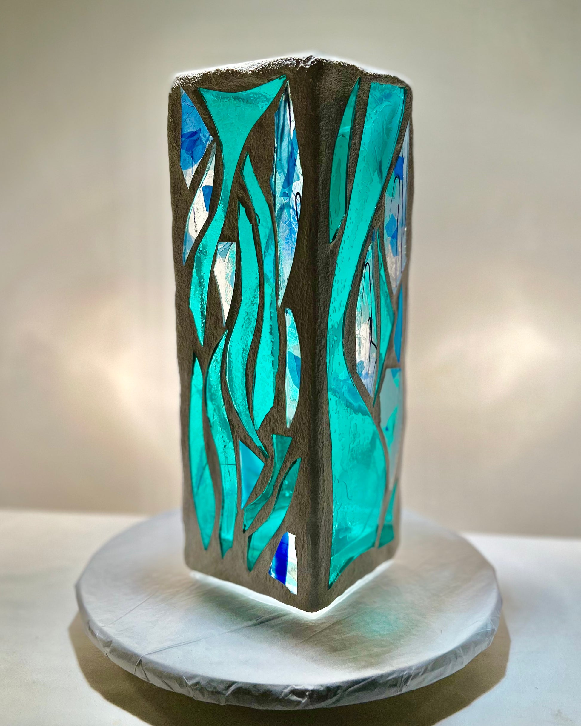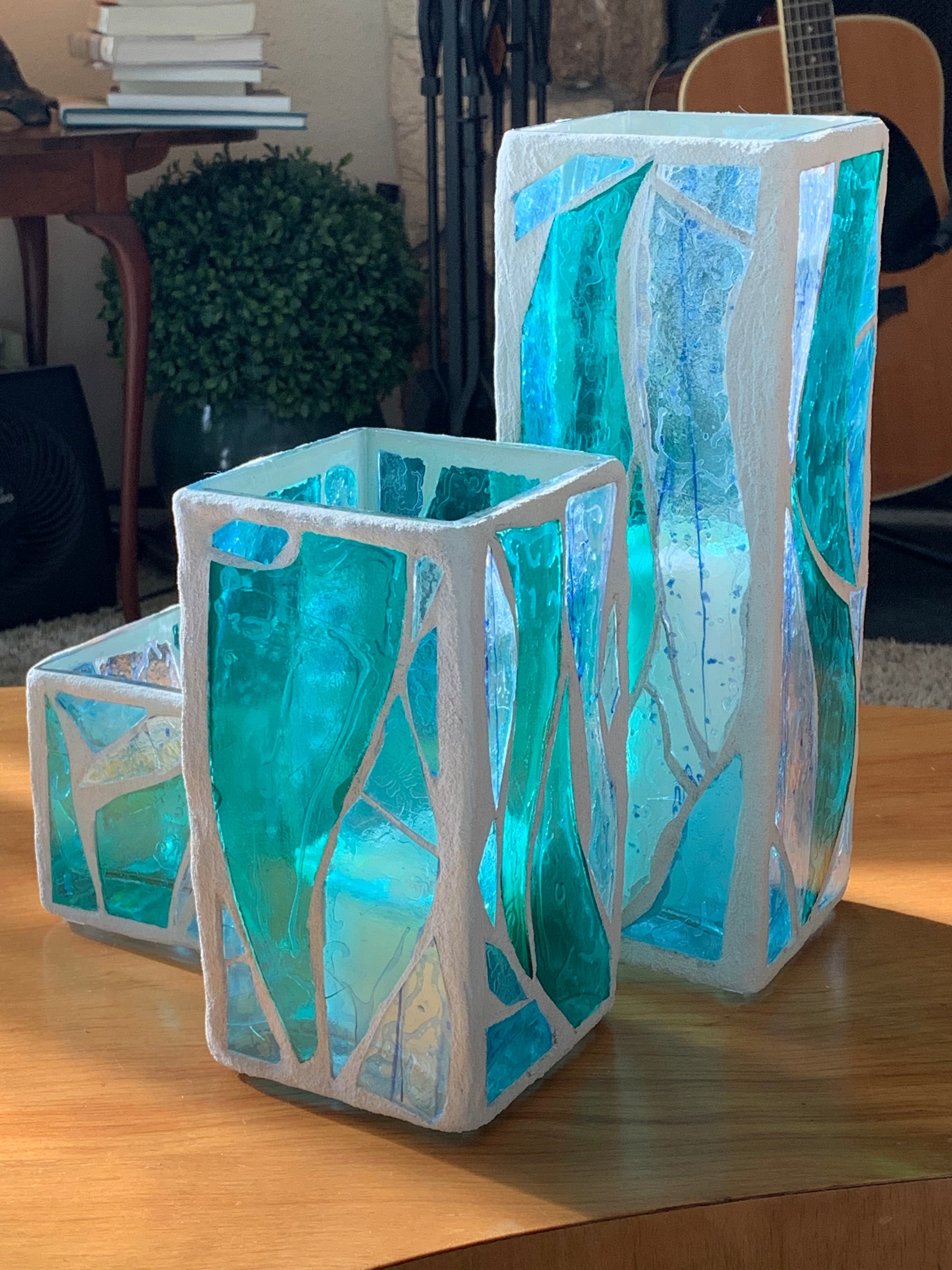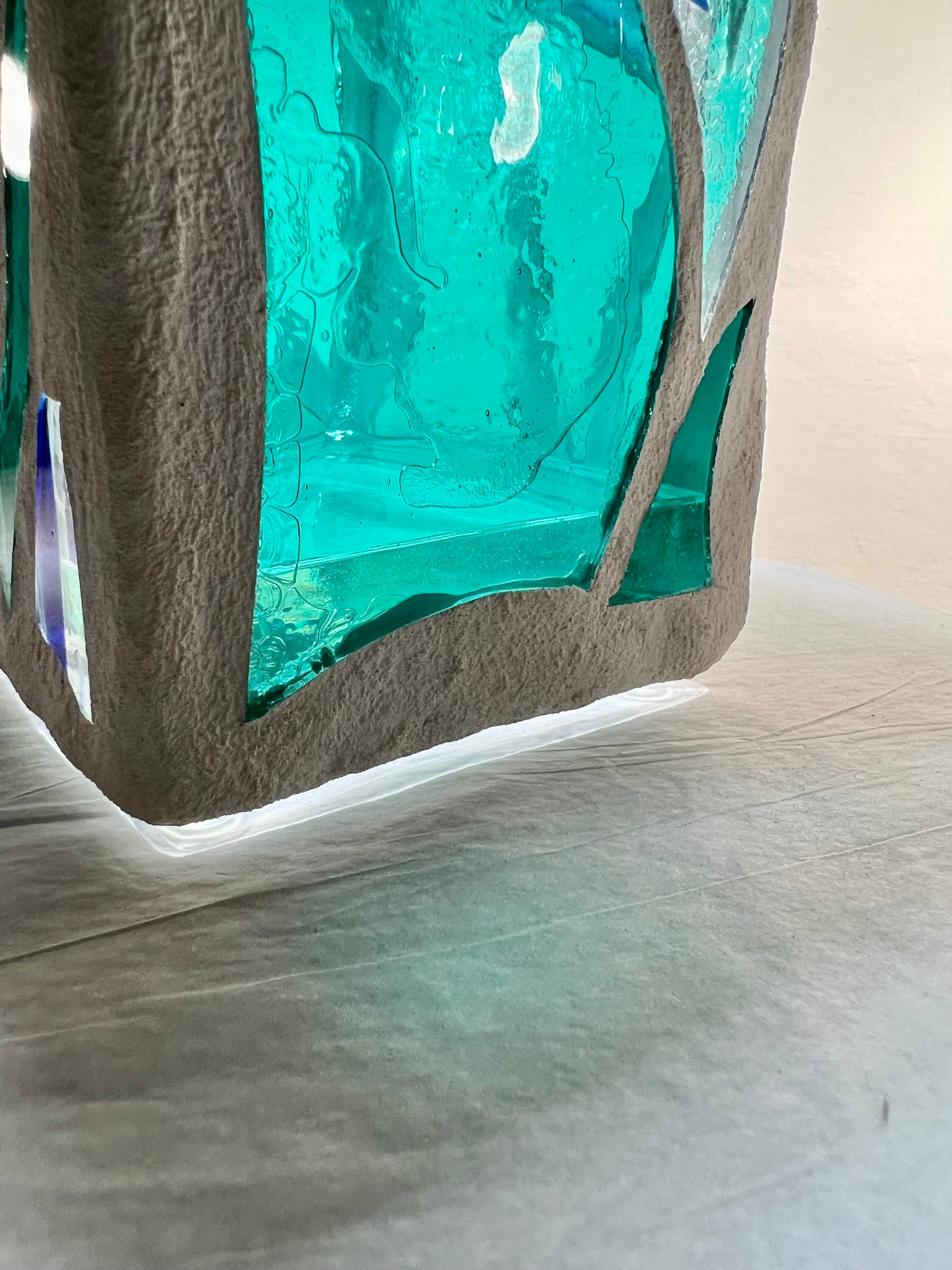 "Big Green Sister OHO" Stained Glass Candle Holder – Green and Blue Glass with White Grout, 12x4x4”