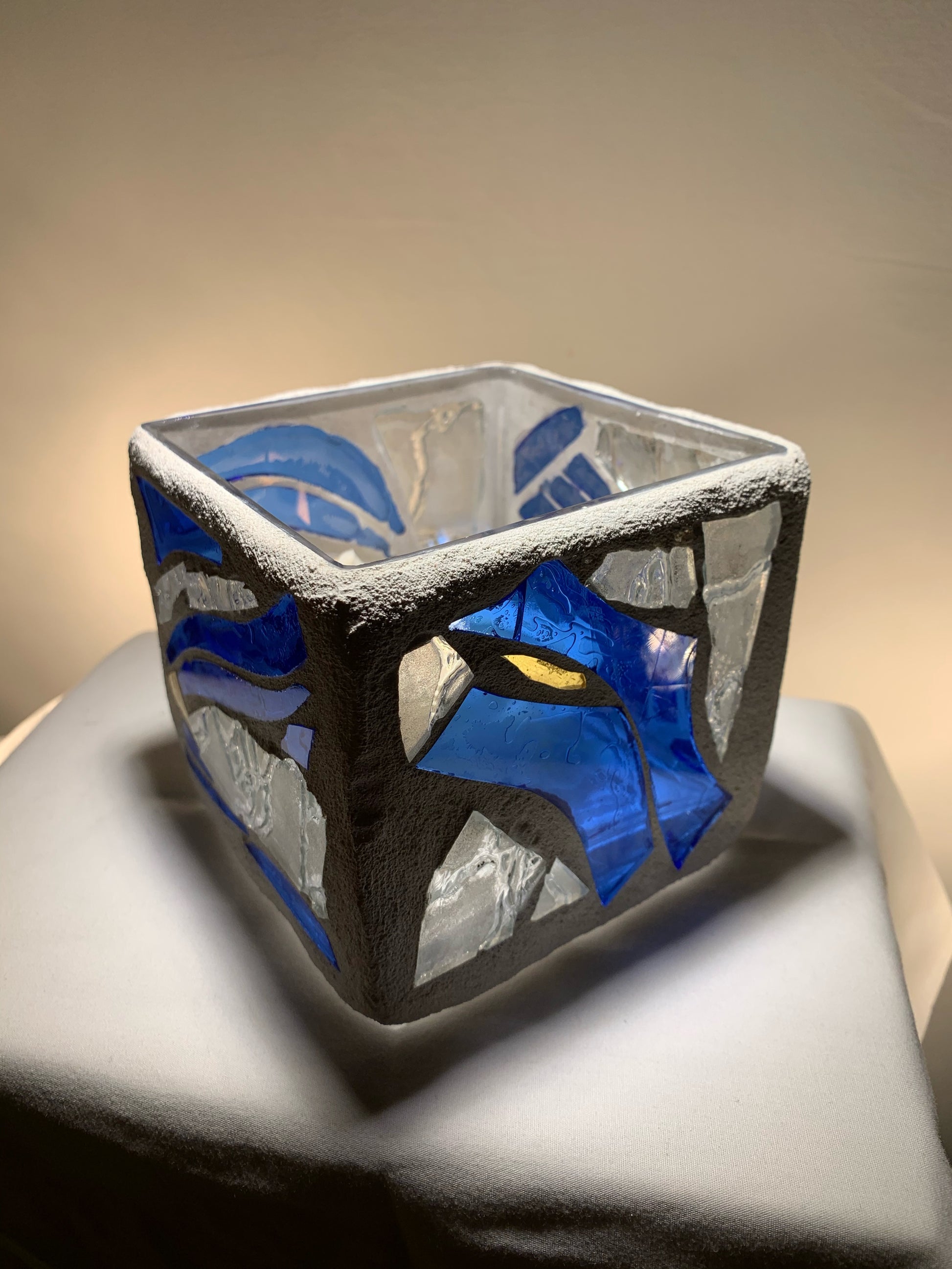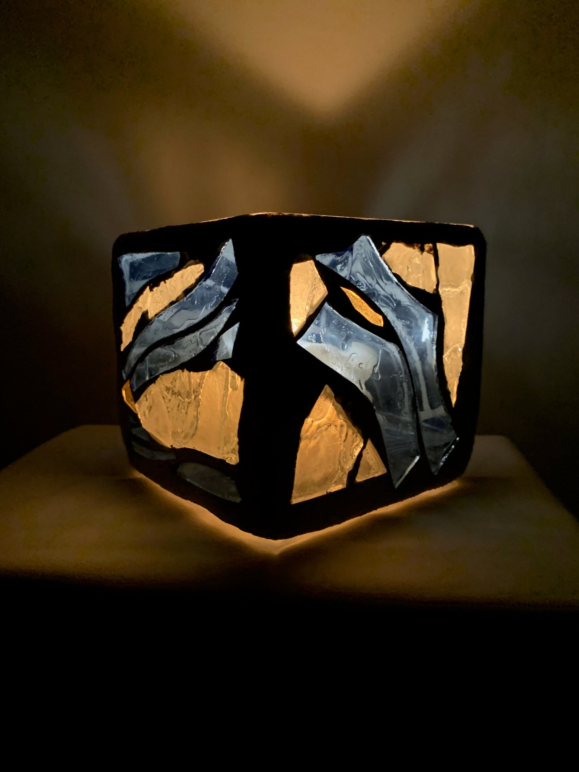 This 4x4x4" candleholder is made in a deep blue, a color that seemed fitting as I found myself listening to Steely Dan's "Home at Last" while working on it. The lyric “...still I remain tied to the mast,” referencing the Sirens from Homer’s The Odyssey, stuck with me, and I ended up naming this piece in their honor. The stained glass I used is a stunning blue paired with my favorite clear glass, which I like to call "Canyons" because of its natural texture. Finished with a Bright White grout, "Siren's Song" captures that haunting allure — hopefully, without luring you too far away!