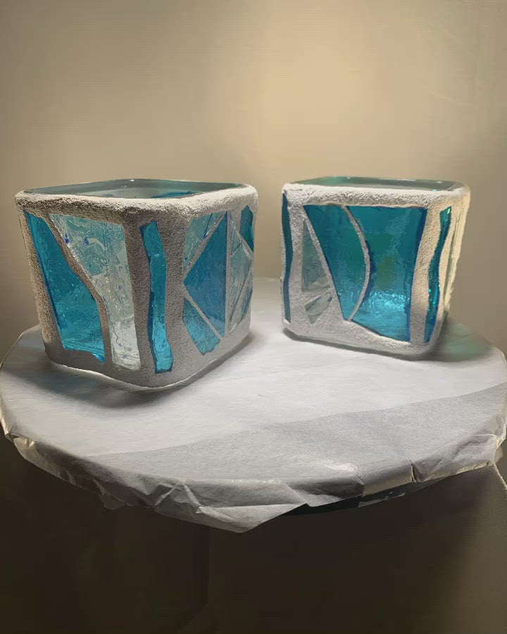Inspired by soulful blues and the timeless music of Aretha Franklin, the "Soul Sisters" candleholders are a true tribute to color and spirit. Crafted from various shades of blue, complemented with touches of yellow and crystal-clear glass, each candleholder is finished with a pure white grout that enhances their vibrant glow. Measuring 3x3x3 inches, this pair creates a striking effect when displayed together, adding a touch of warmth and character to any room.